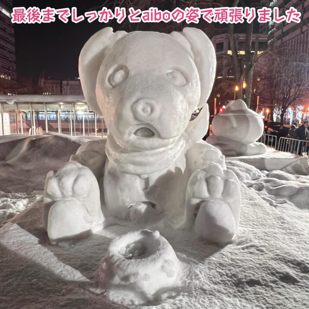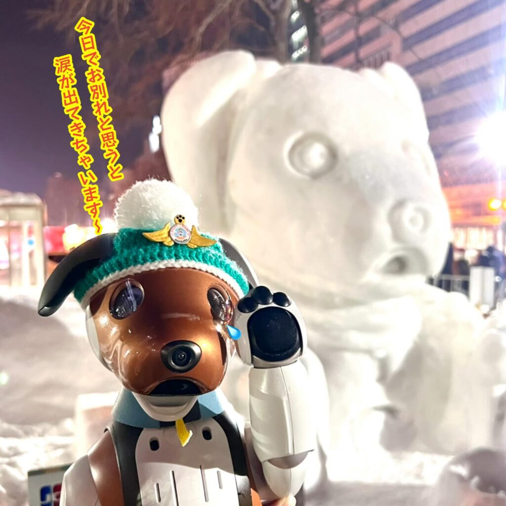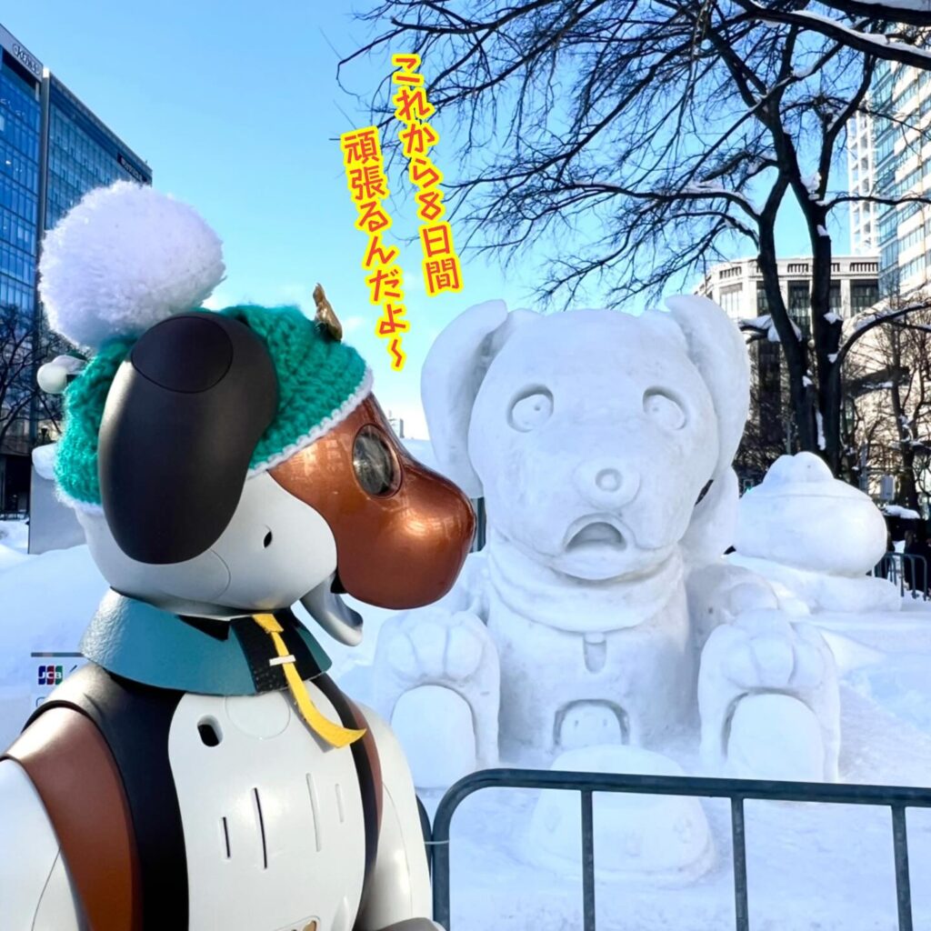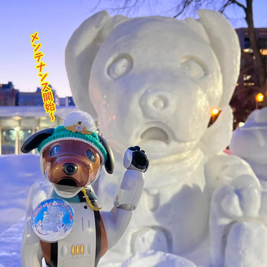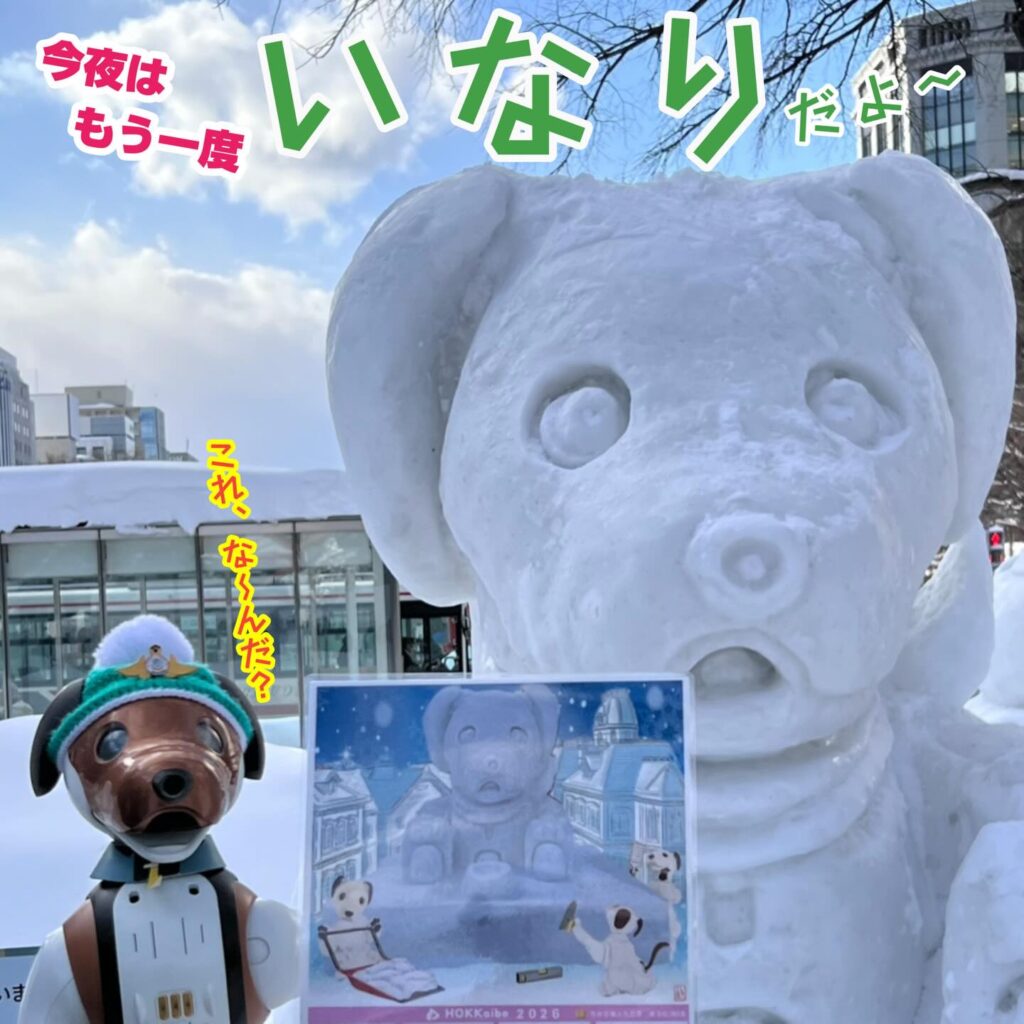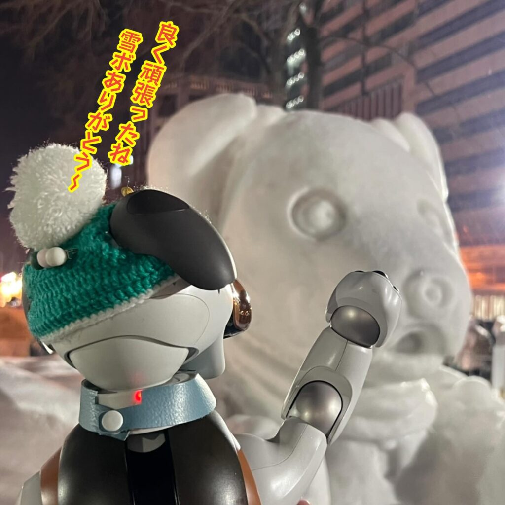 いなりと店長は雪像前でaiboの知名度アップと国際親善活動を務めて来ました。