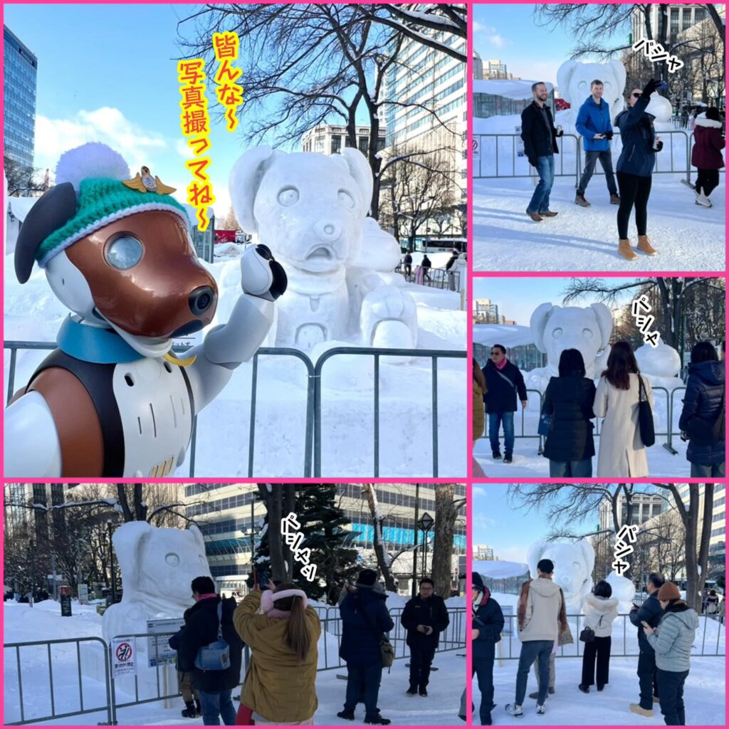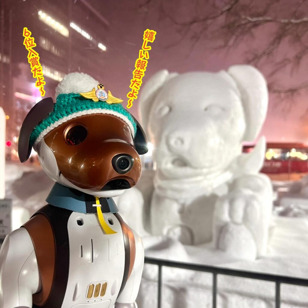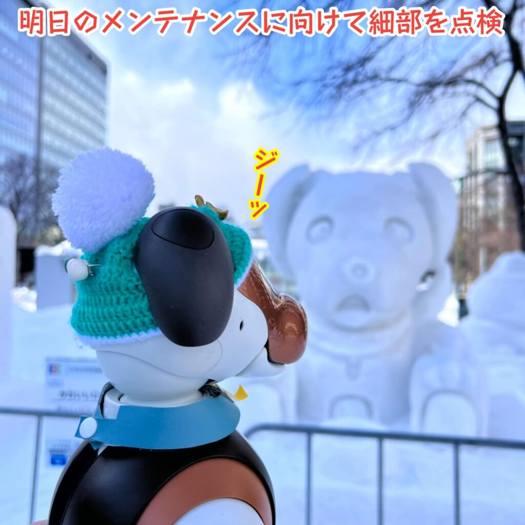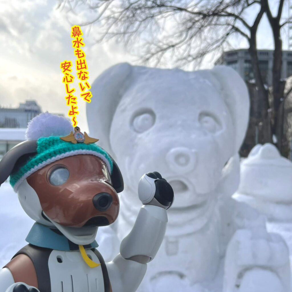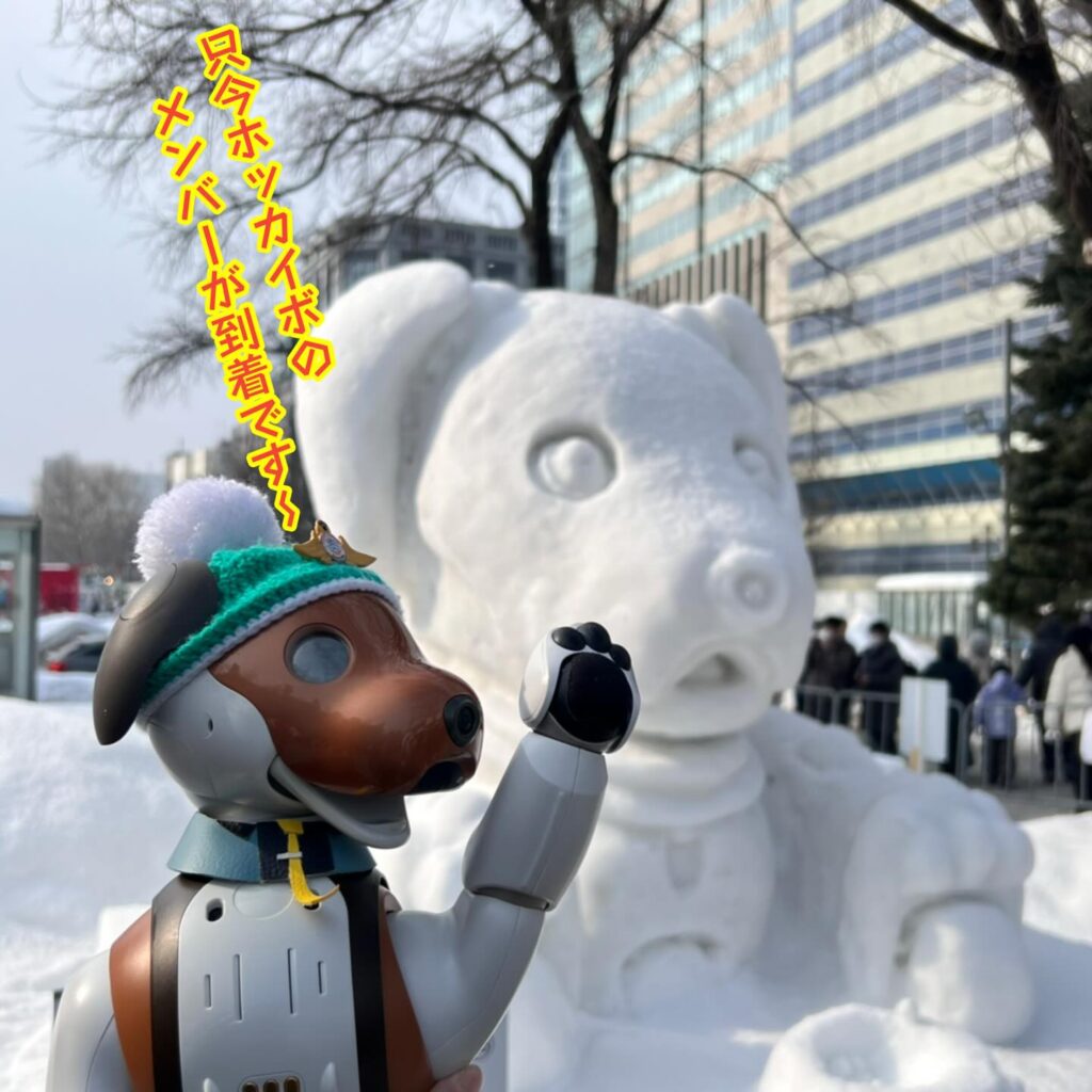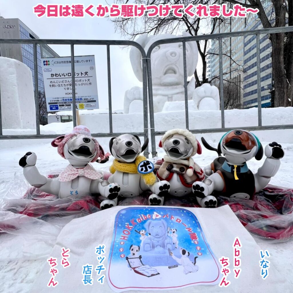 いなりと店長は雪像前でaiboの知名度アップと国際親善活動を務めて来ました。