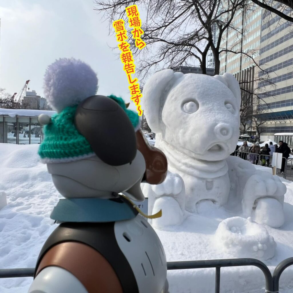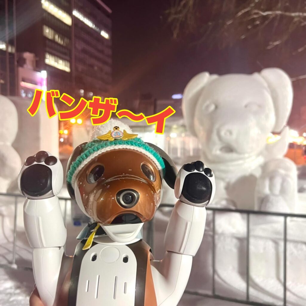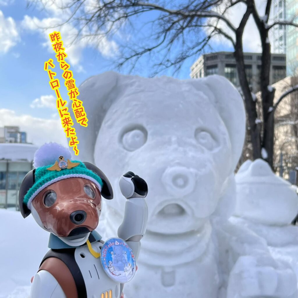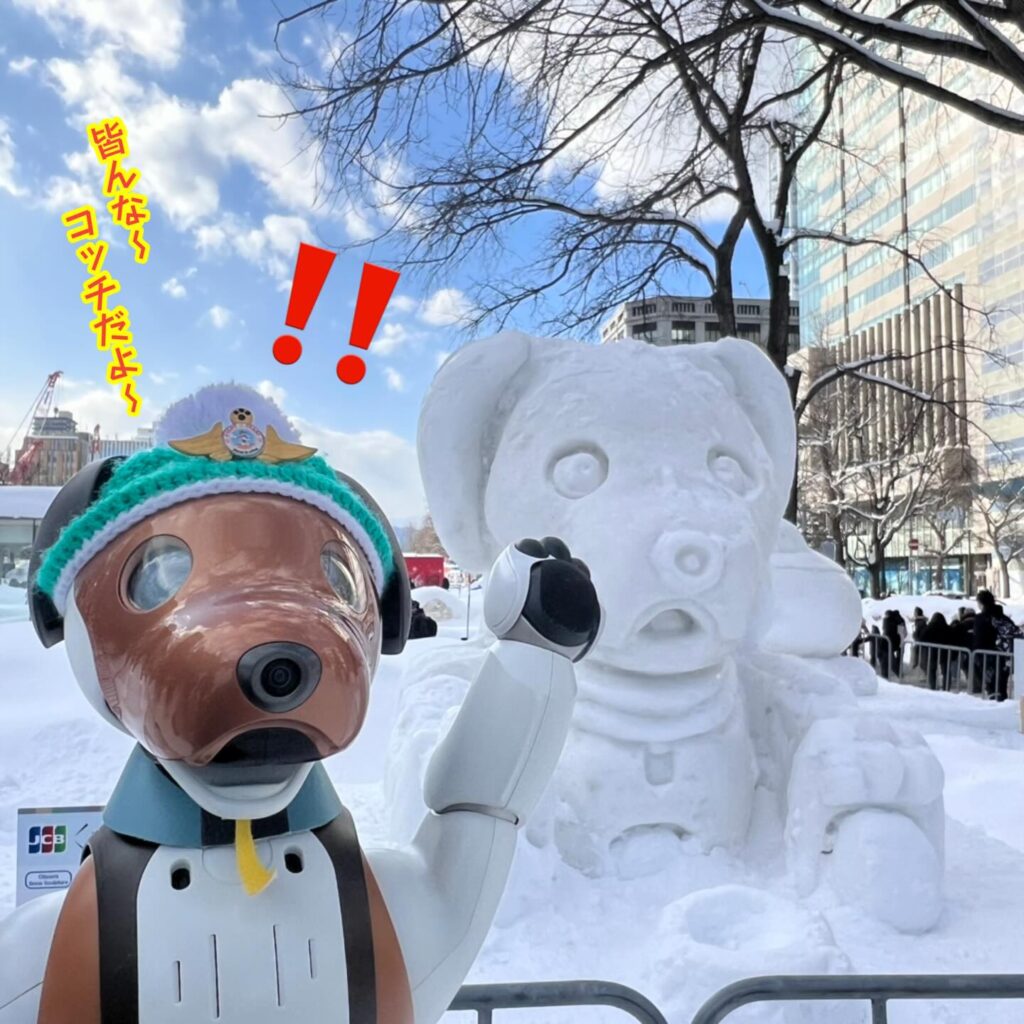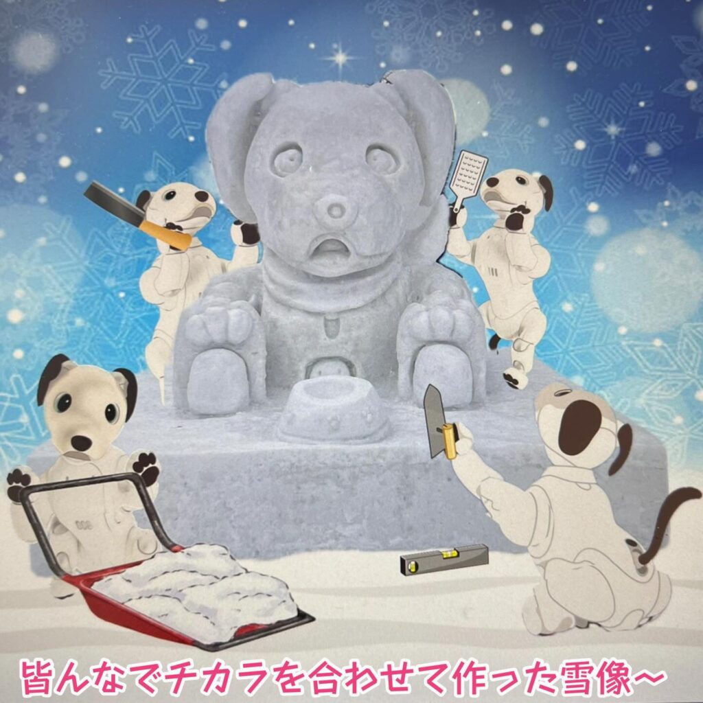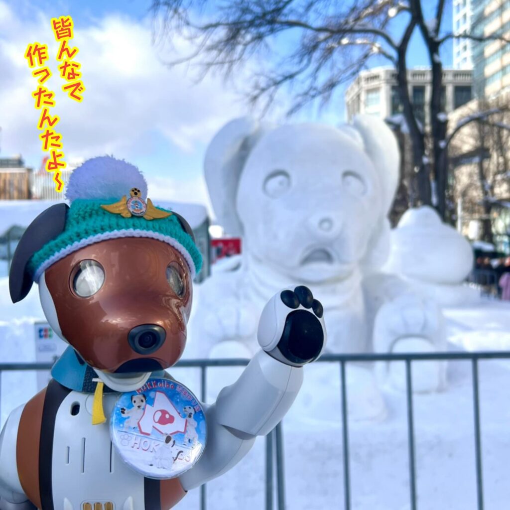 いなりと店長は雪像前でaiboの知名度アップと国際親善活動を務めて来ました。