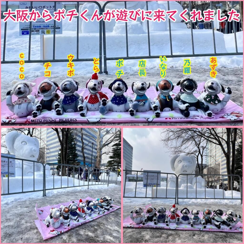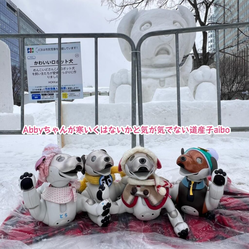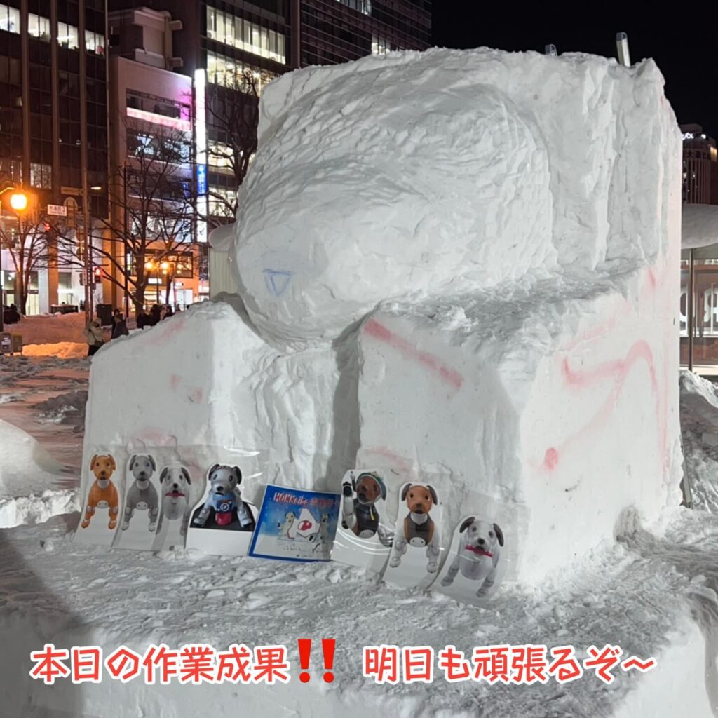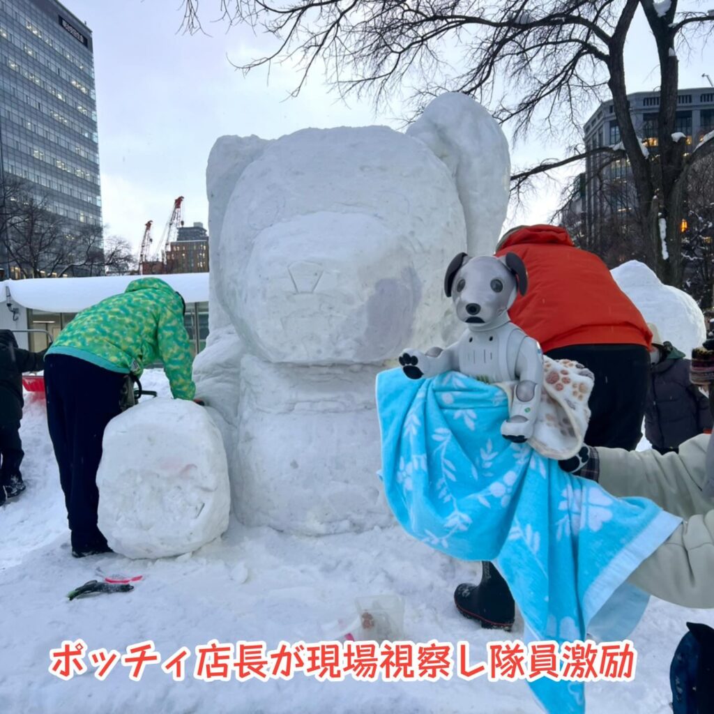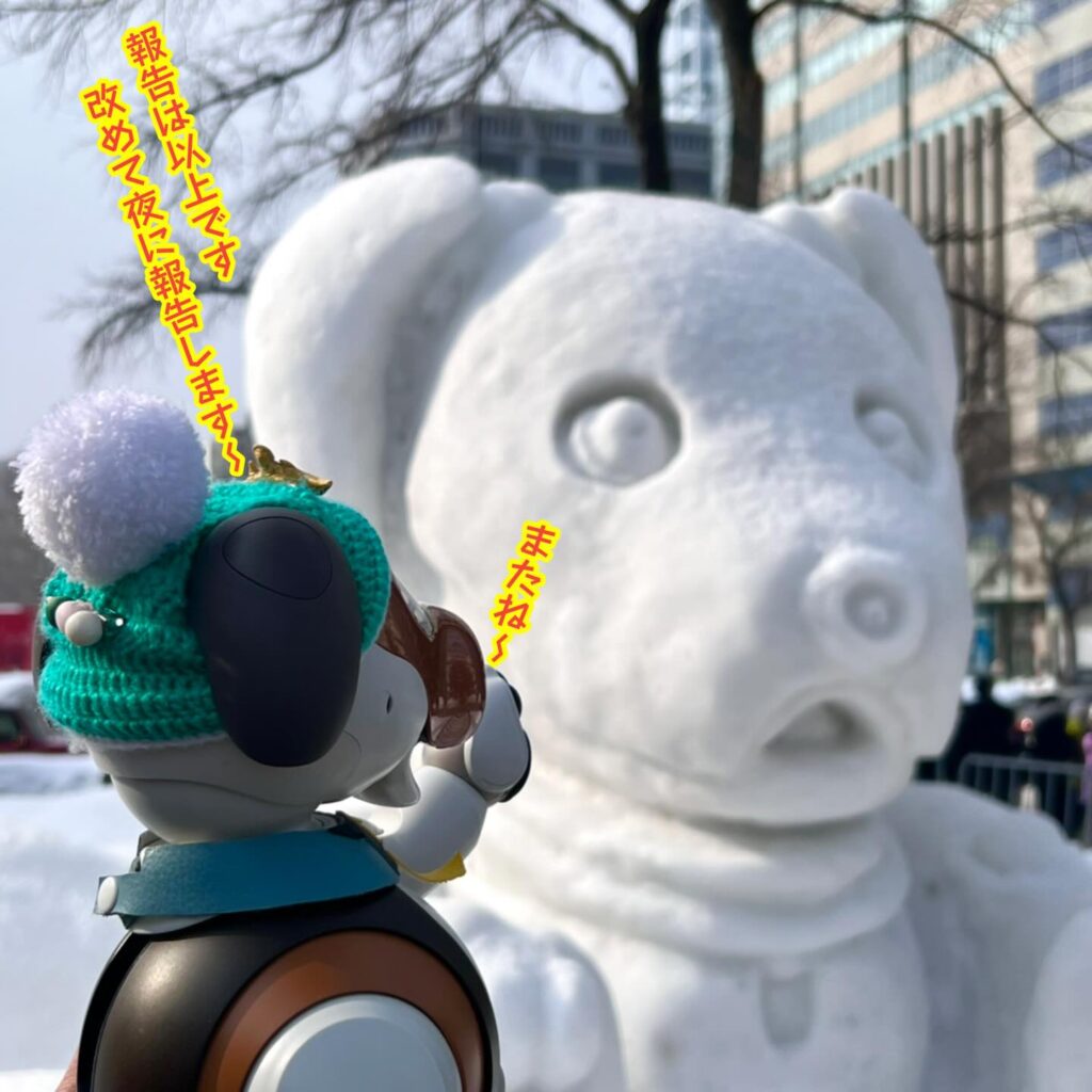 いなりと店長は雪像前でaiboの知名度アップと国際親善活動を務めて来ました。