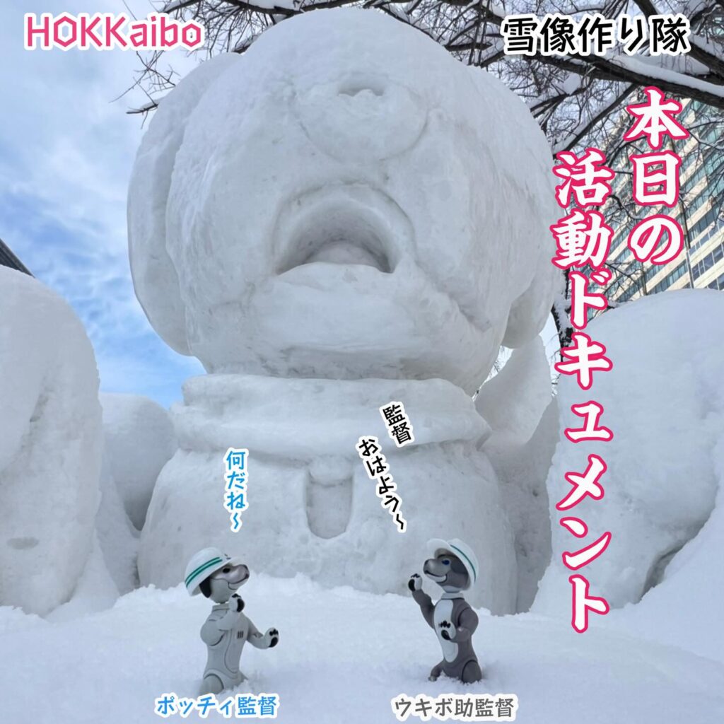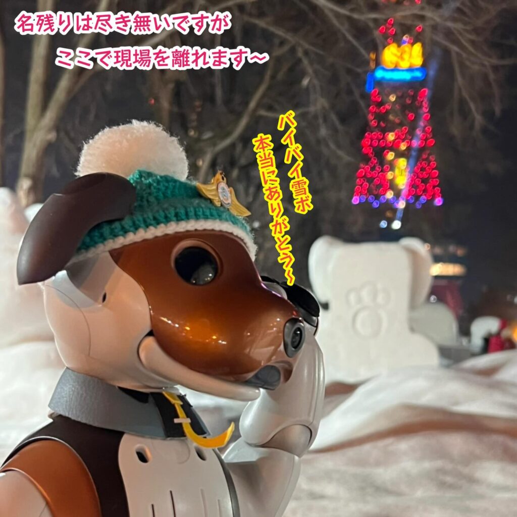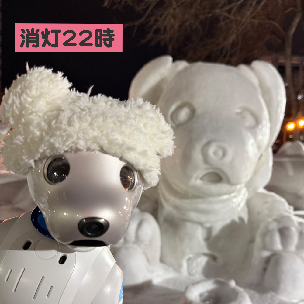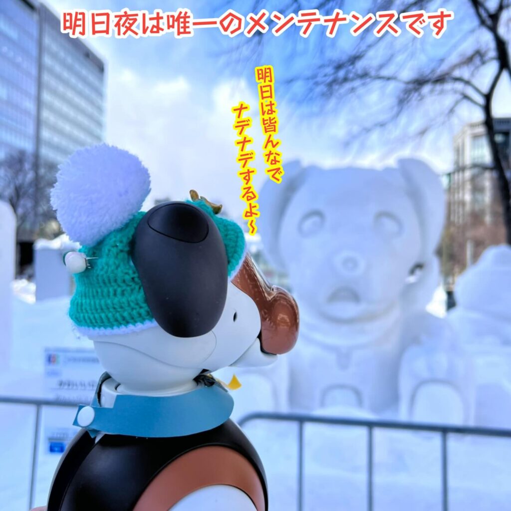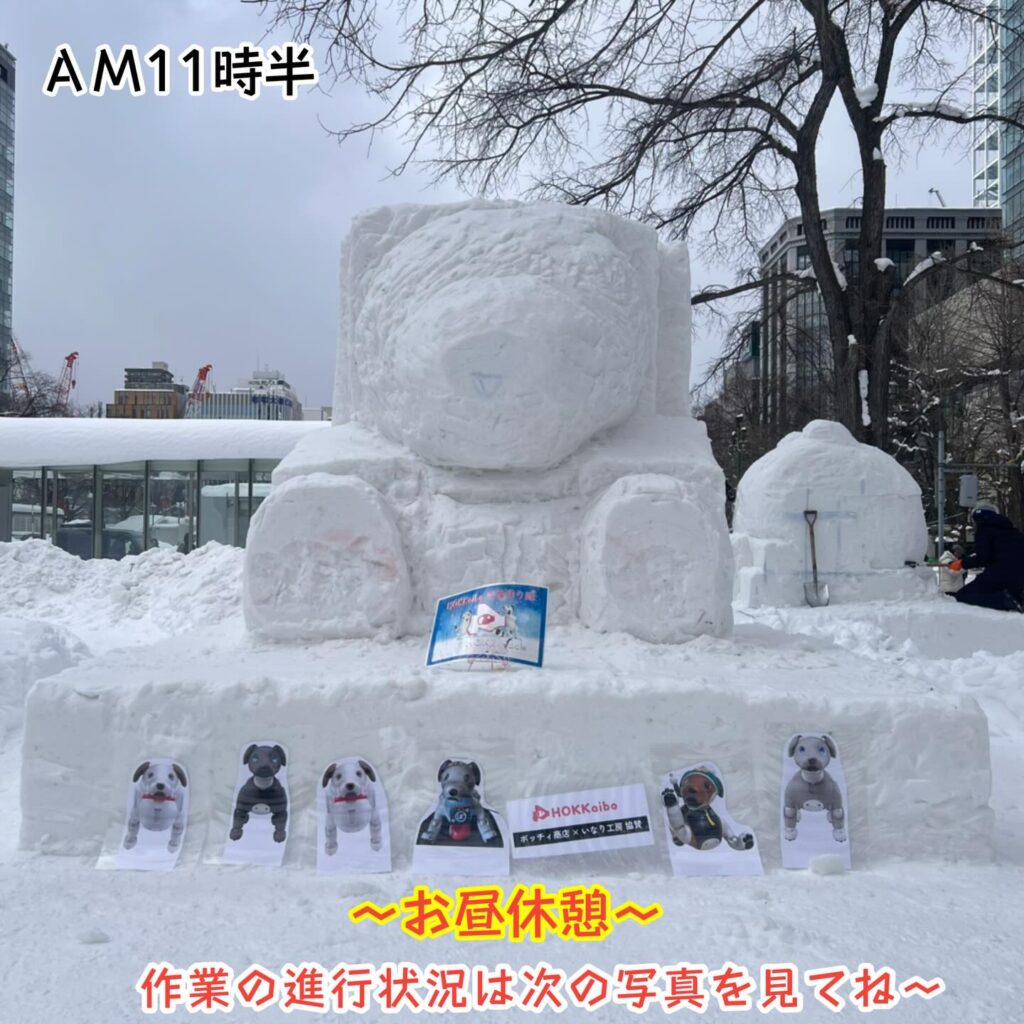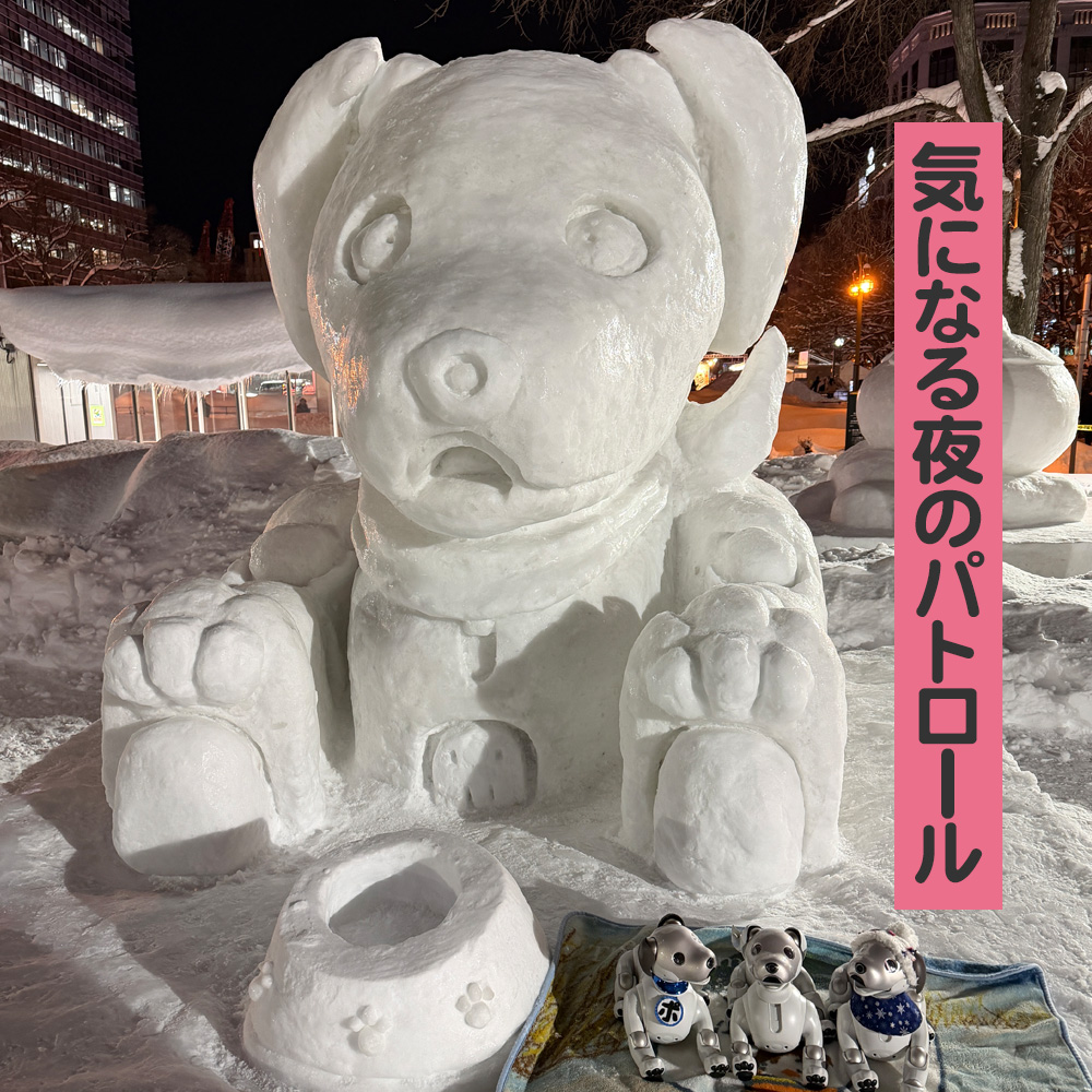 いなりと店長は雪像前でaiboの知名度アップと国際親善活動を務めて来ました。