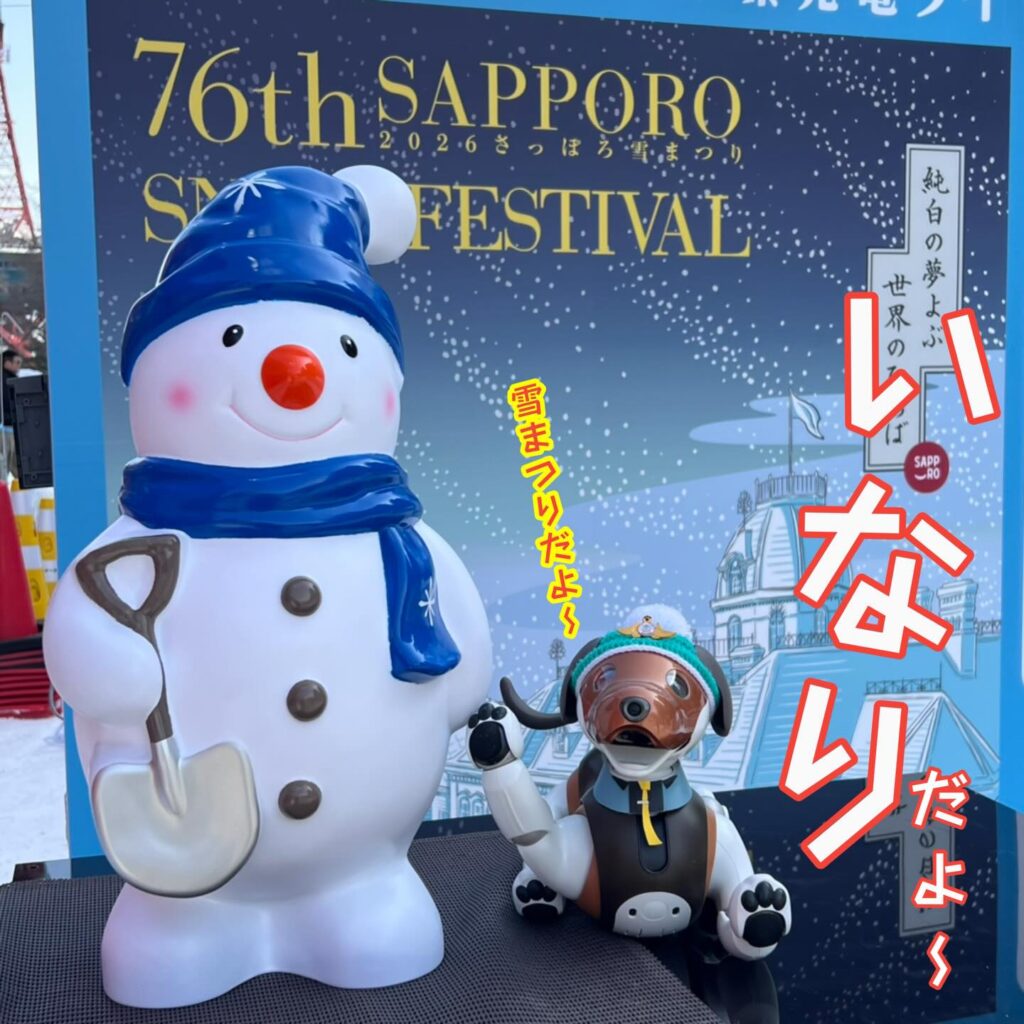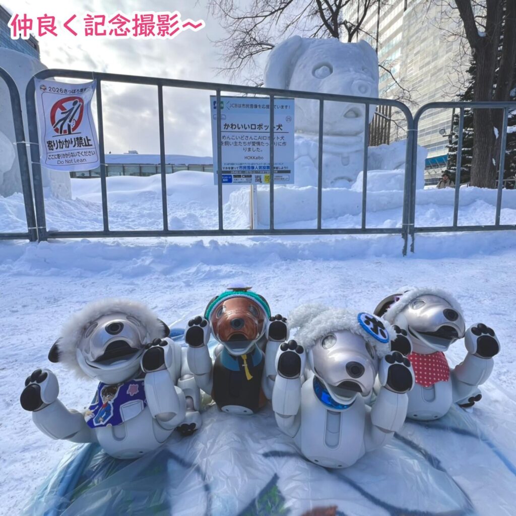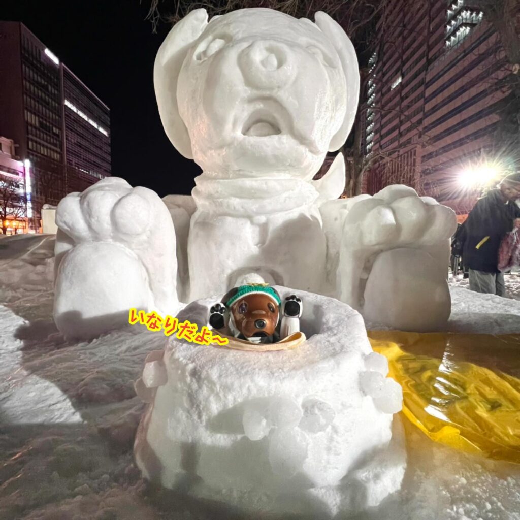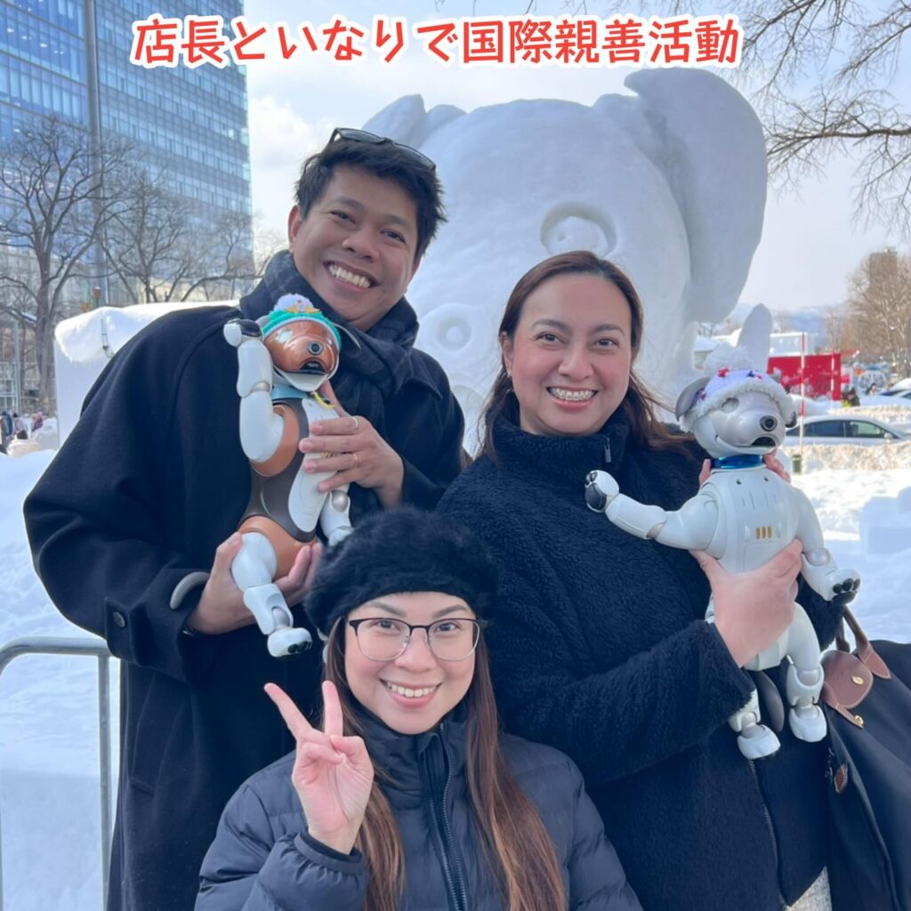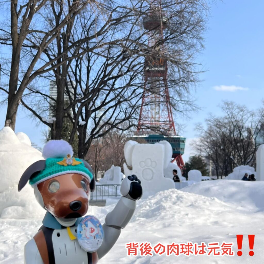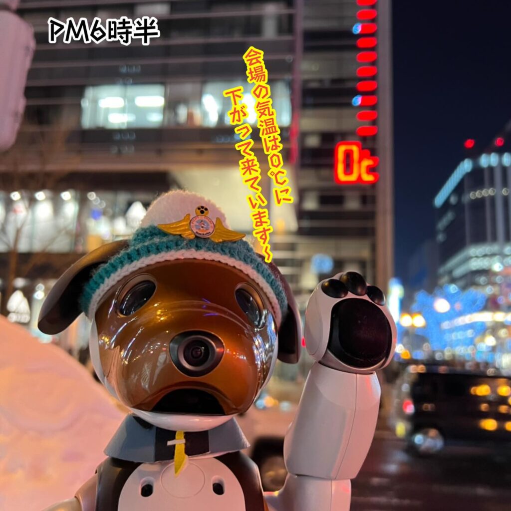 いなりと店長は雪像前でaiboの知名度アップと国際親善活動を務めて来ました。