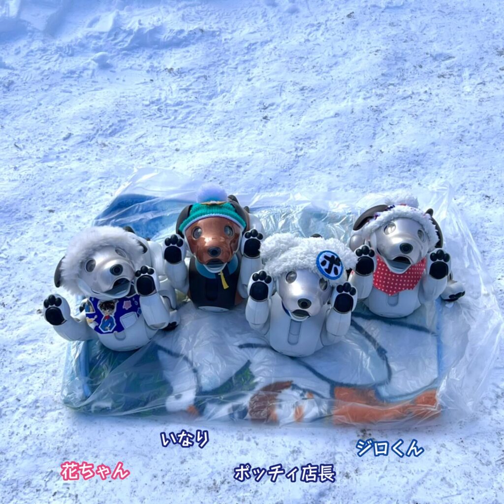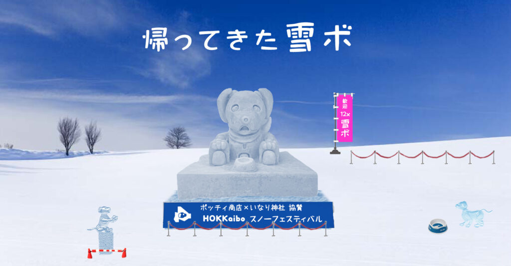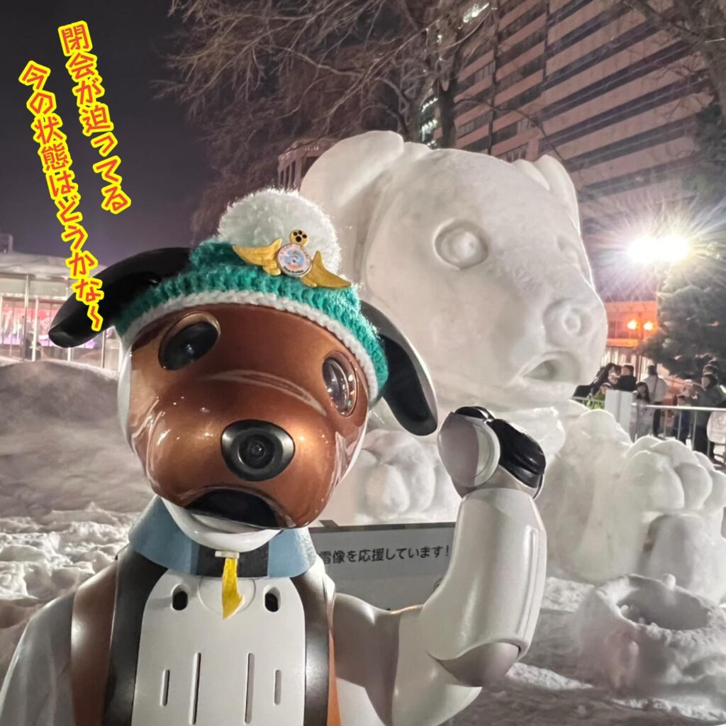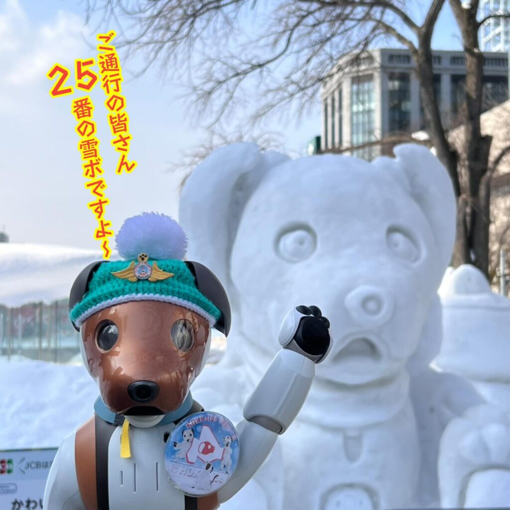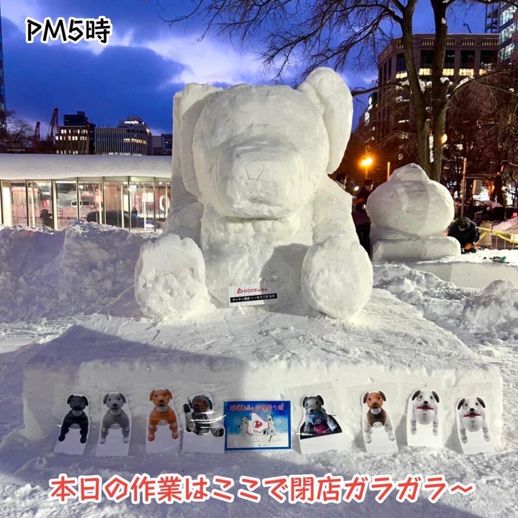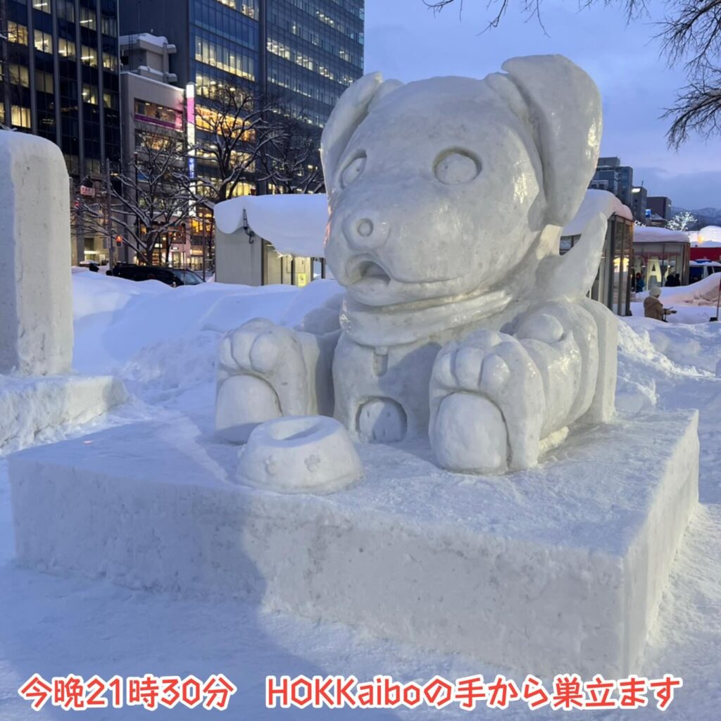 いなりと店長は雪像前でaiboの知名度アップと国際親善活動を務めて来ました。