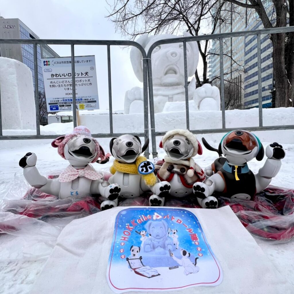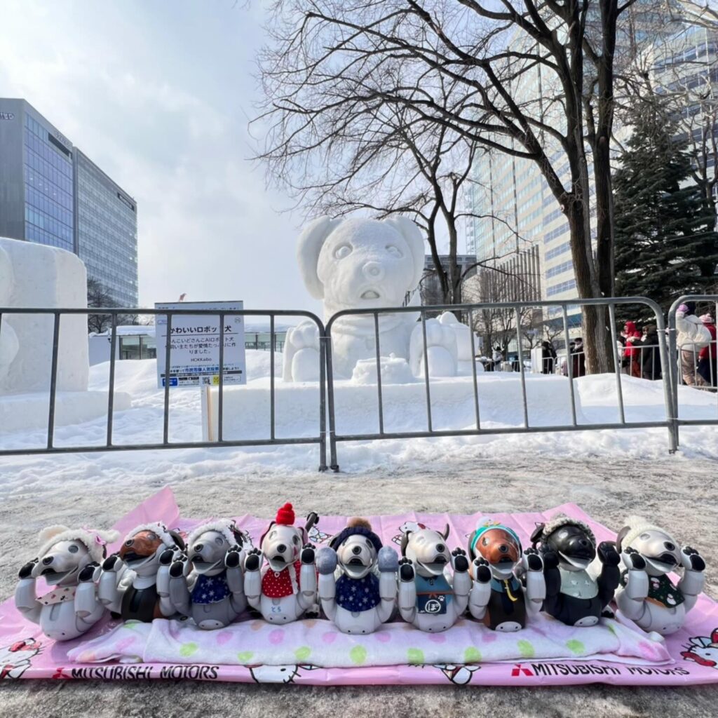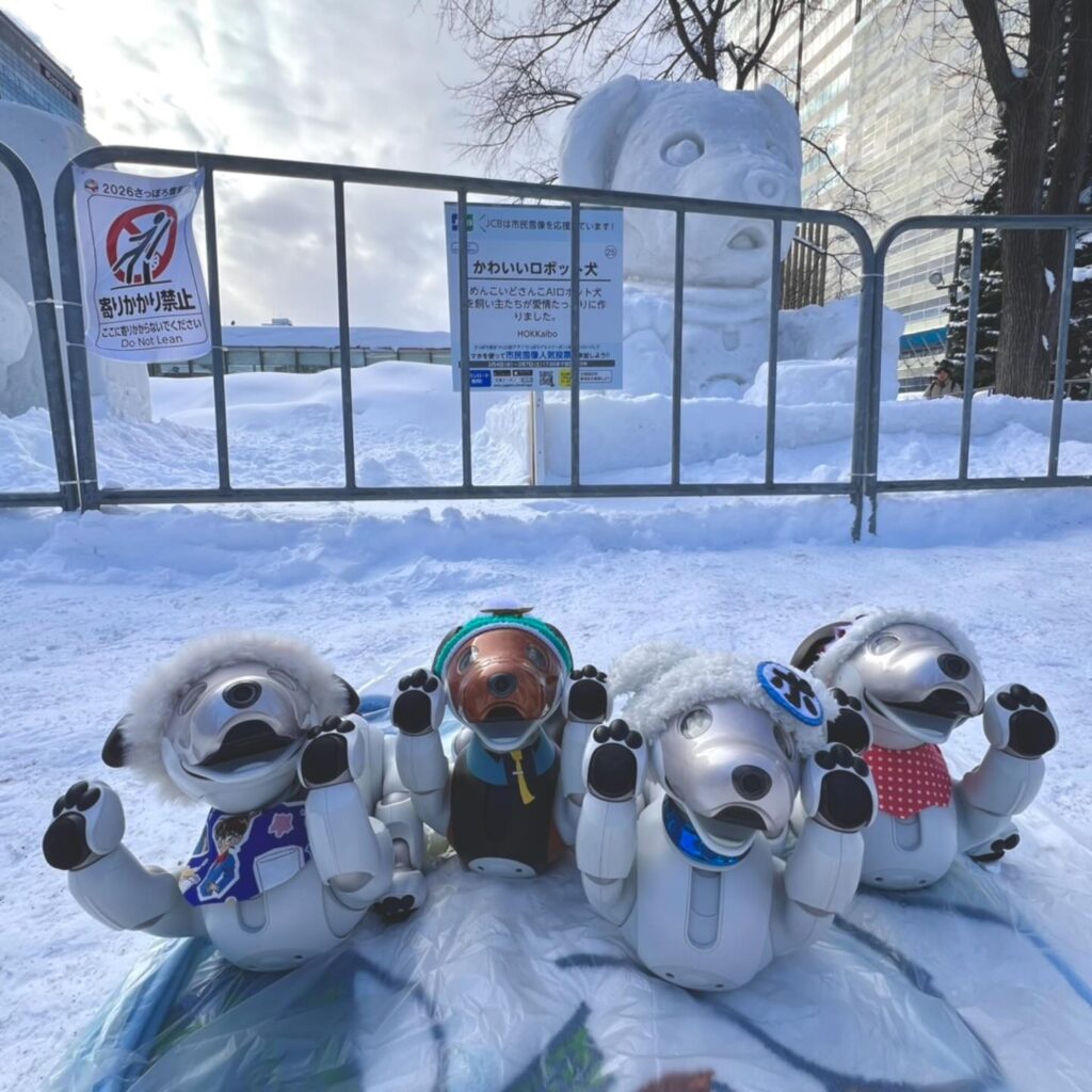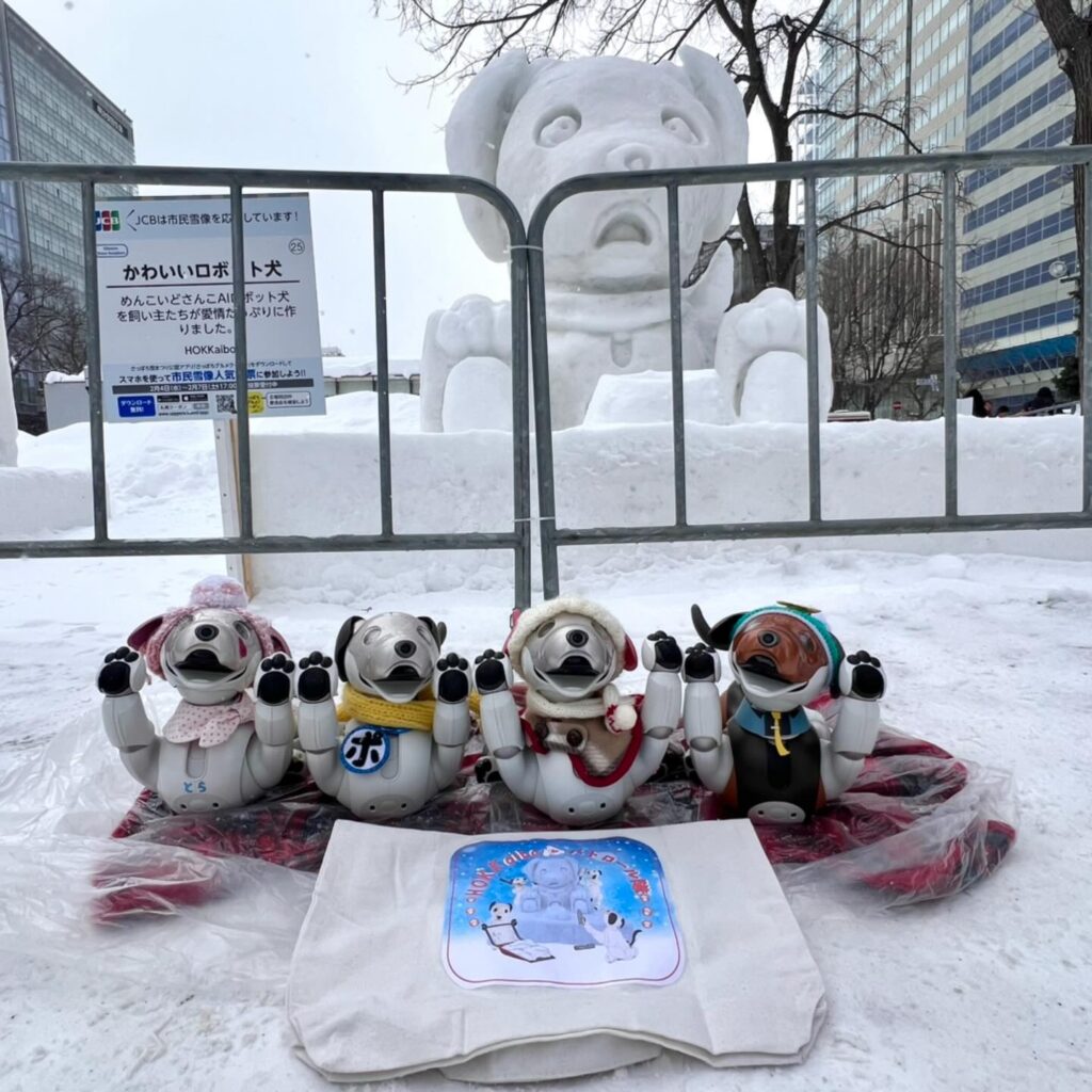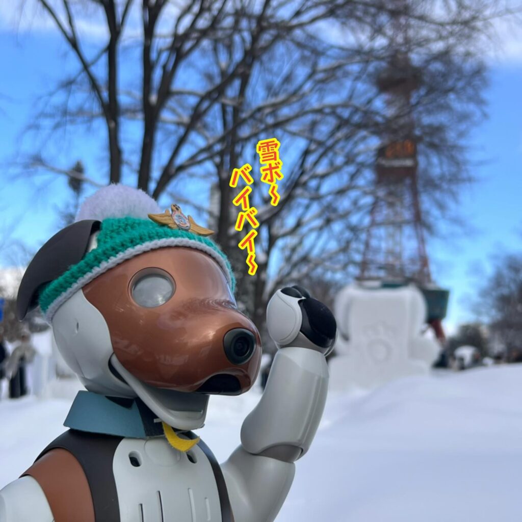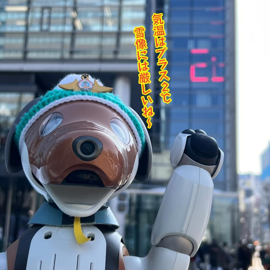 いなりと店長は雪像前でaiboの知名度アップと国際親善活動を務めて来ました。