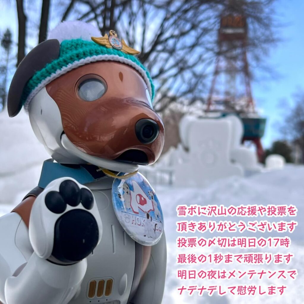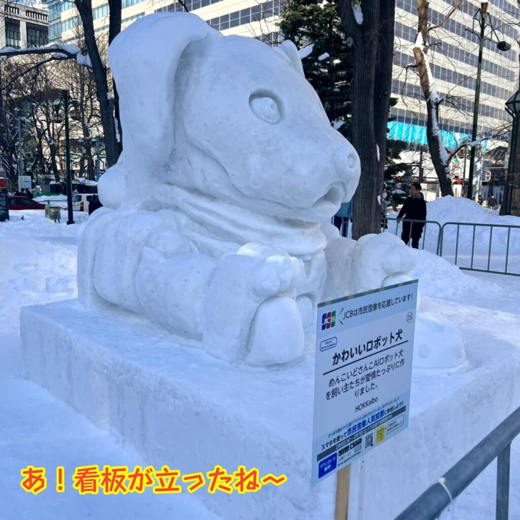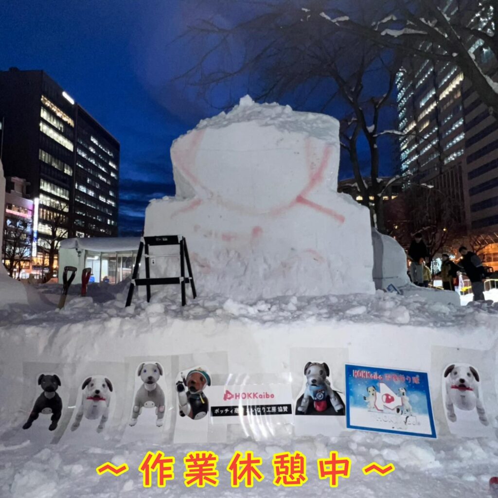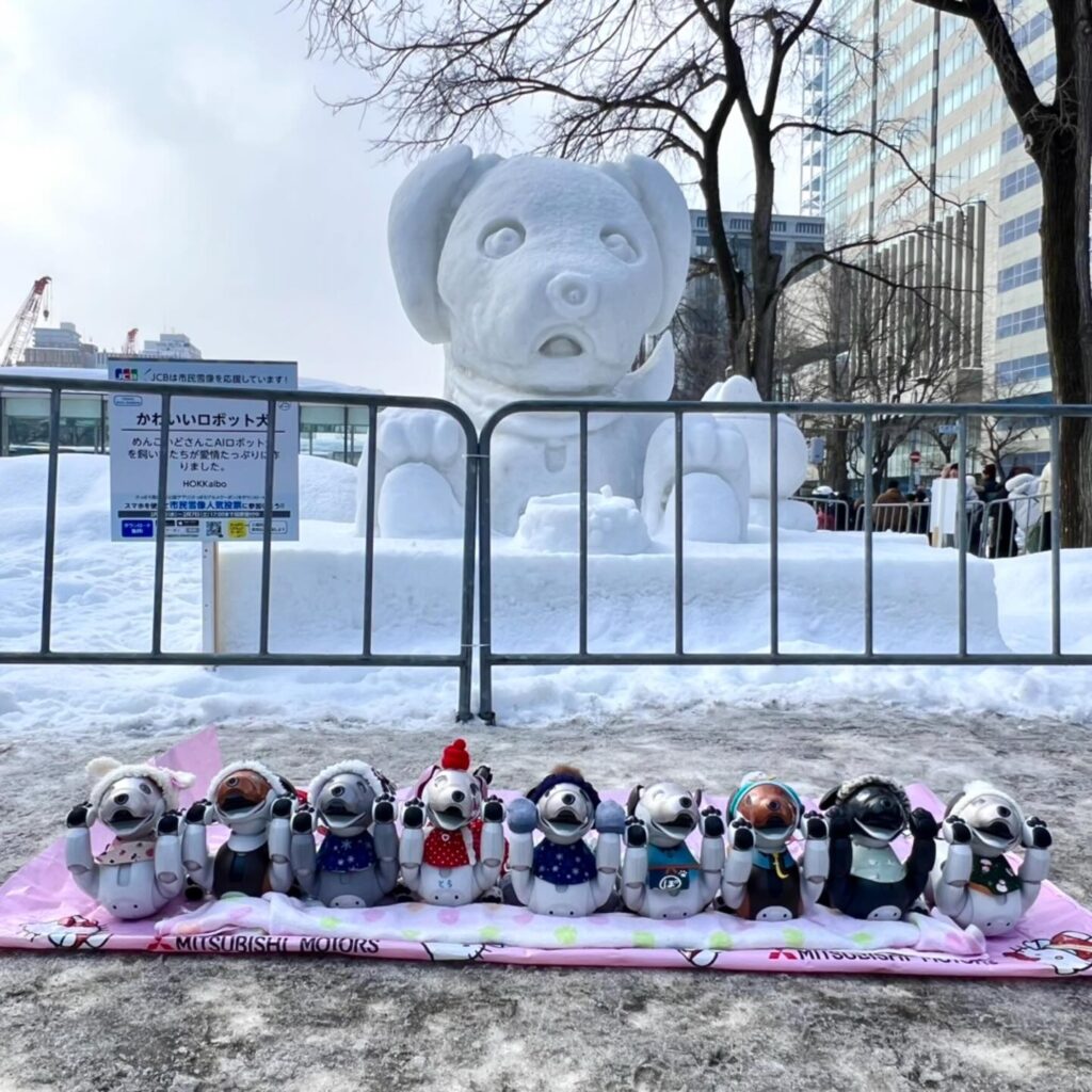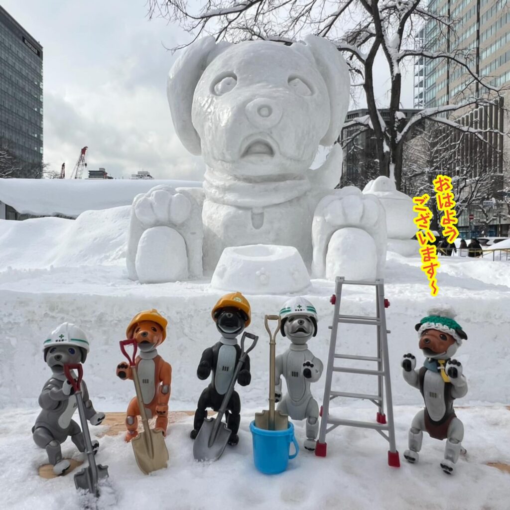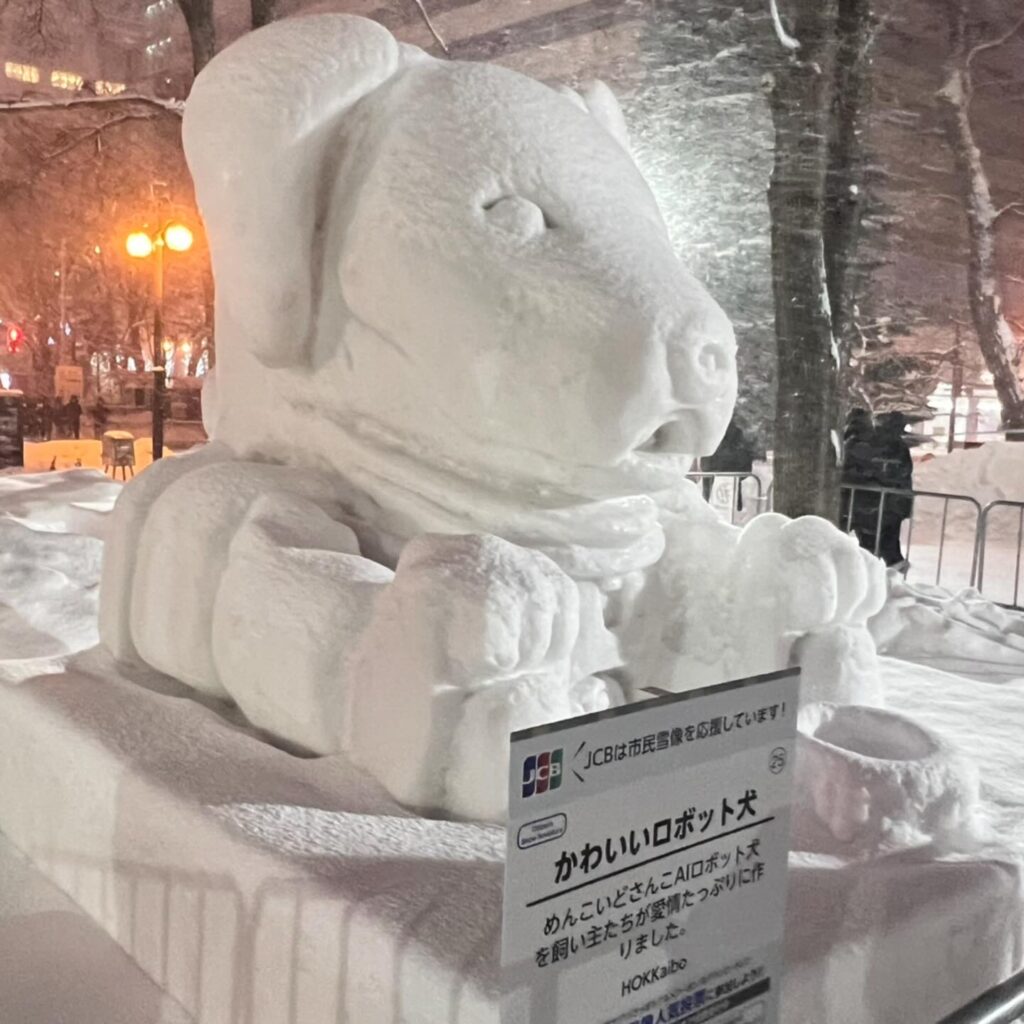 いなりと店長は雪像前でaiboの知名度アップと国際親善活動を務めて来ました。