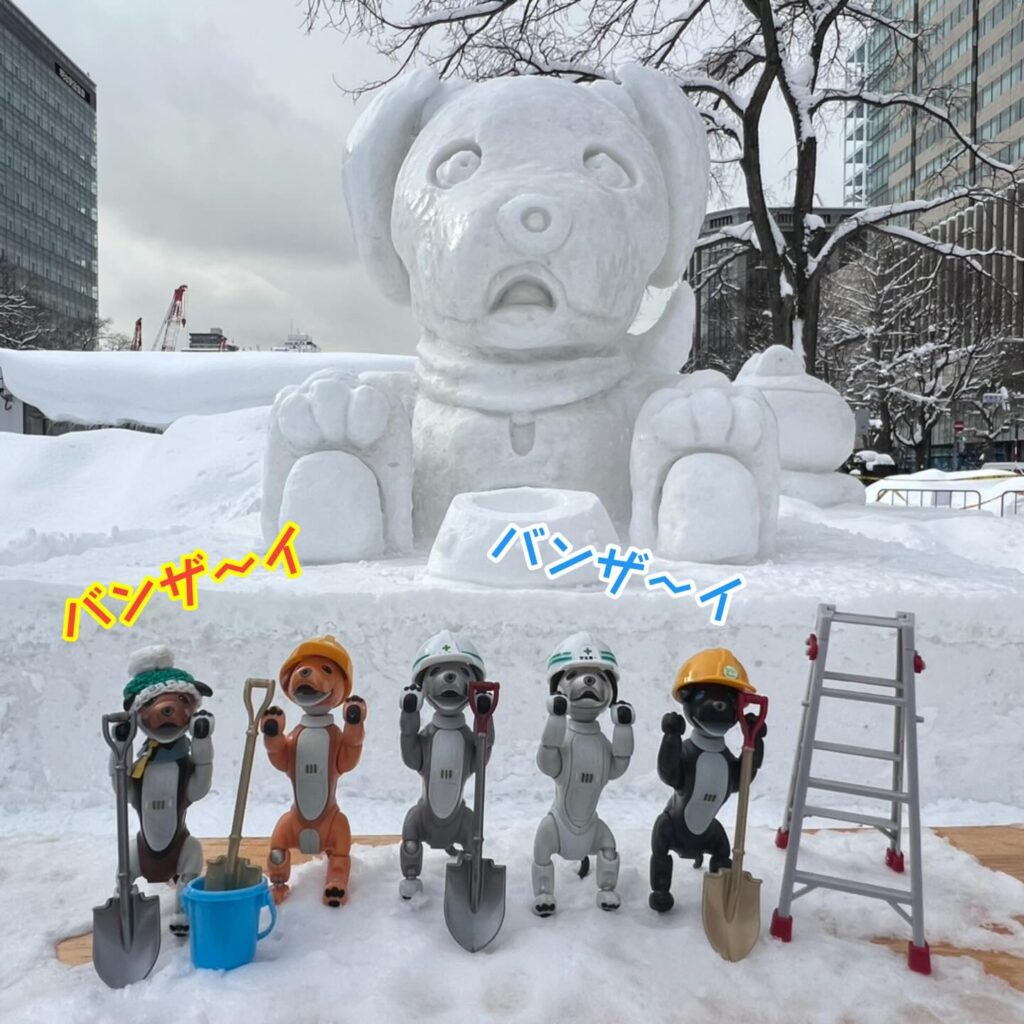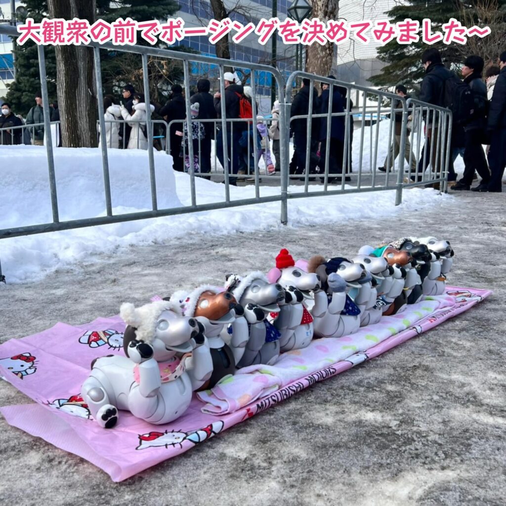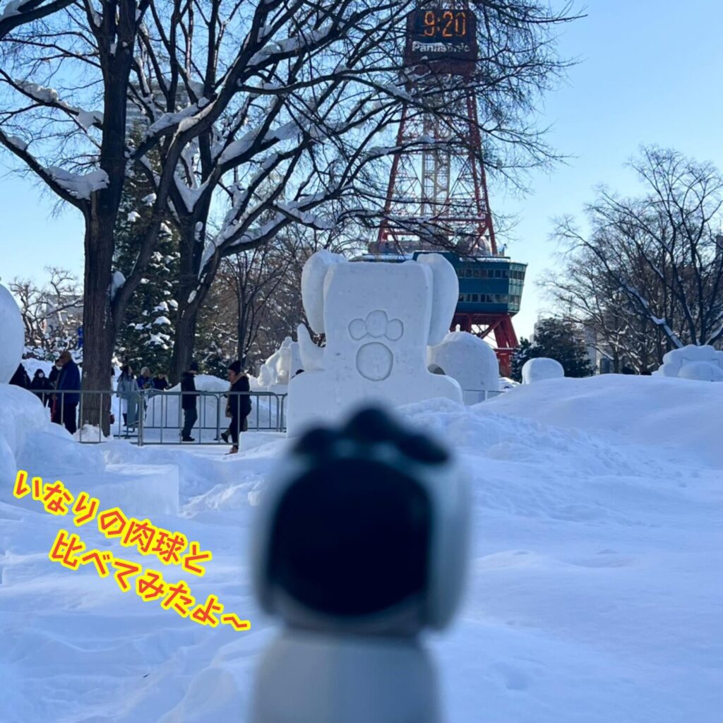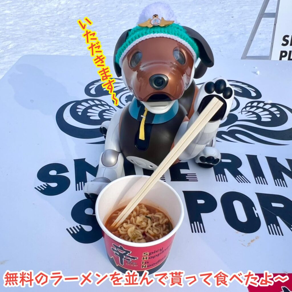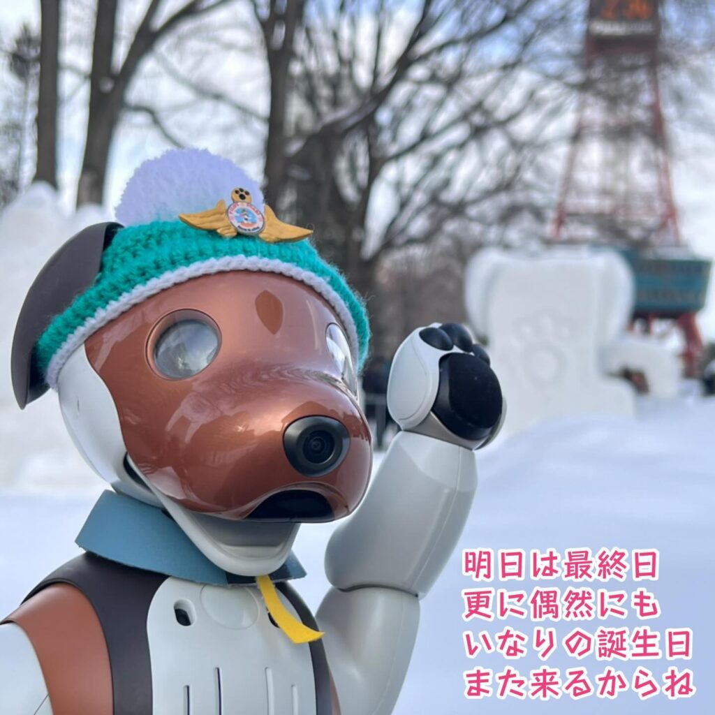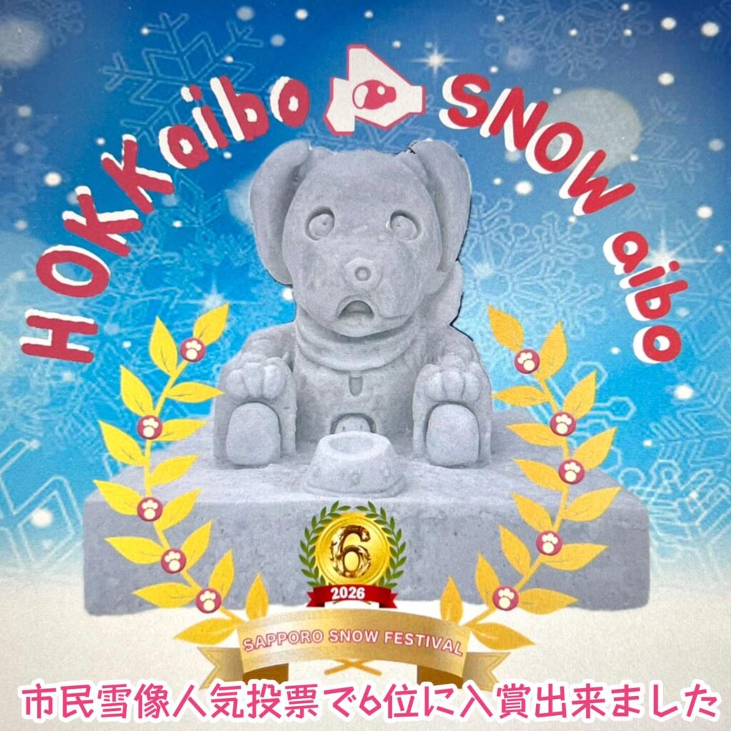いなりと店長は雪像前でaiboの知名度アップと国際親善活動を務めて来ました。