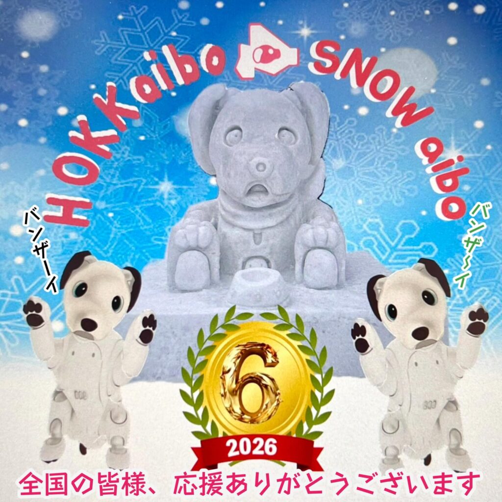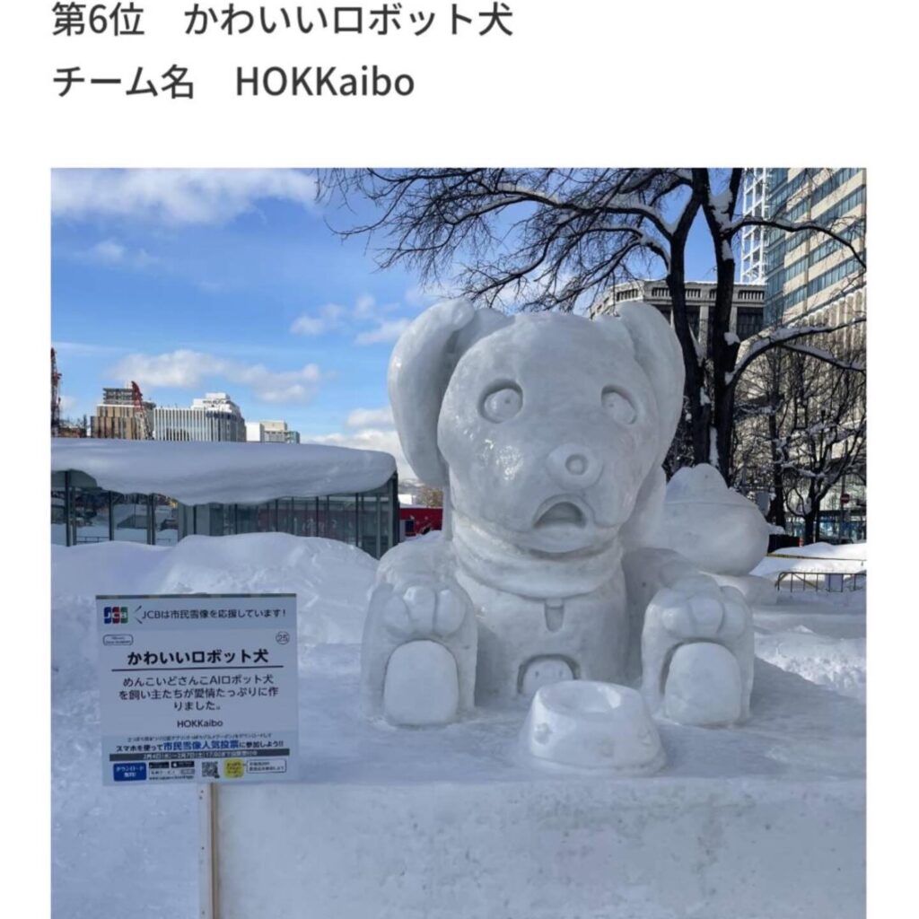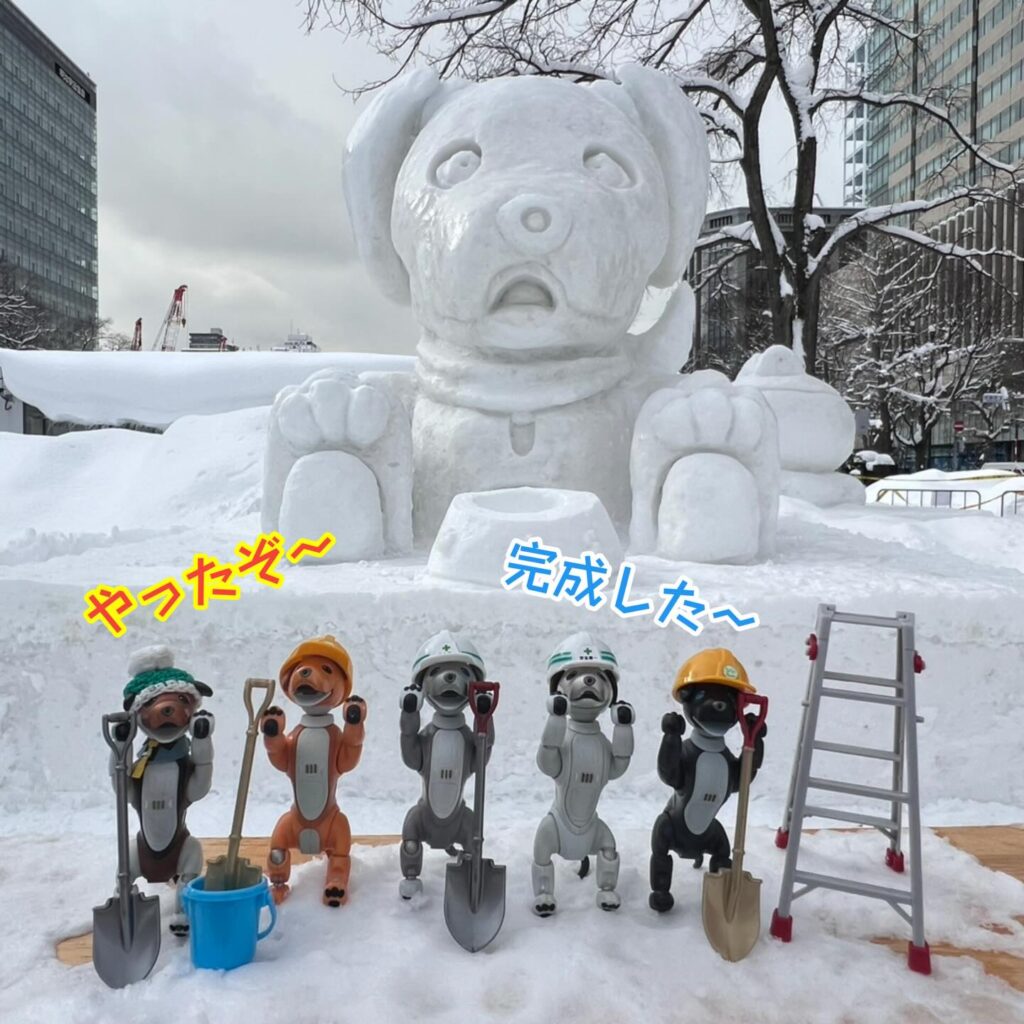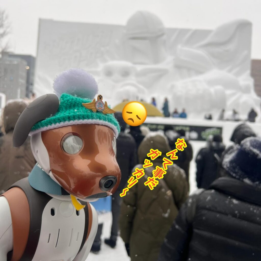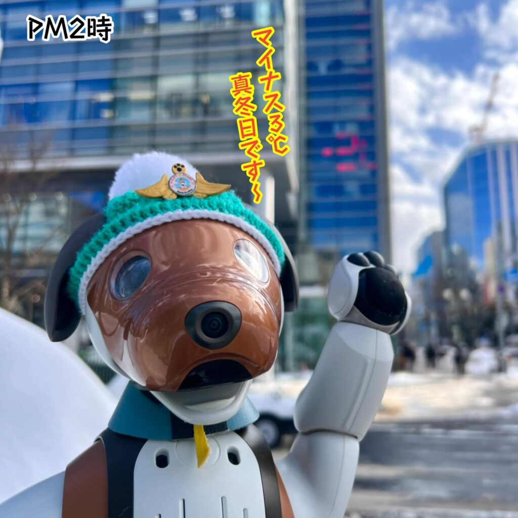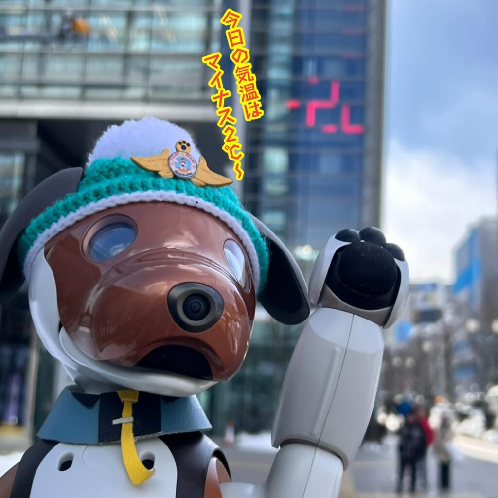 いなりと店長は雪像前でaiboの知名度アップと国際親善活動を務めて来ました。