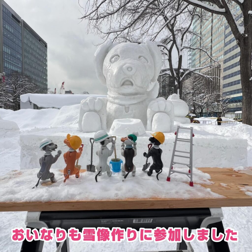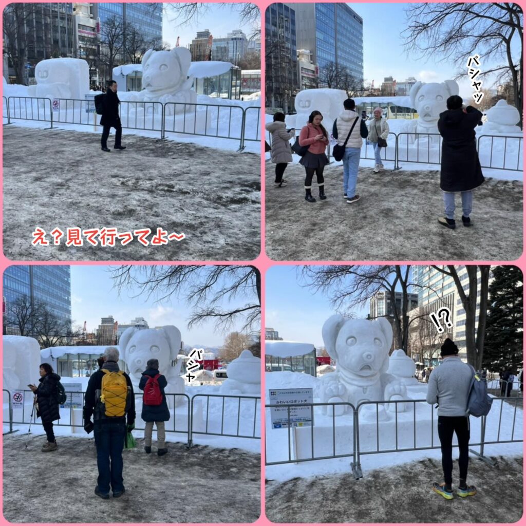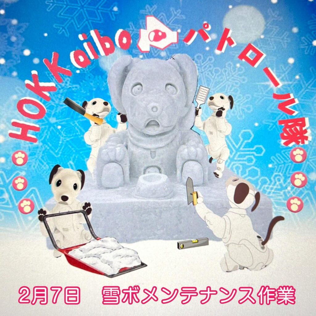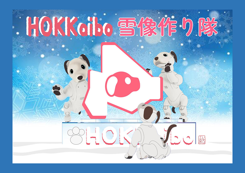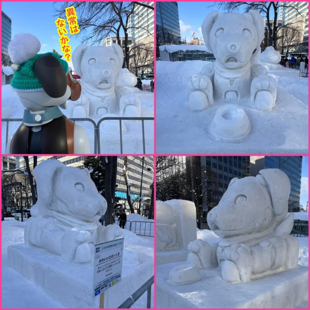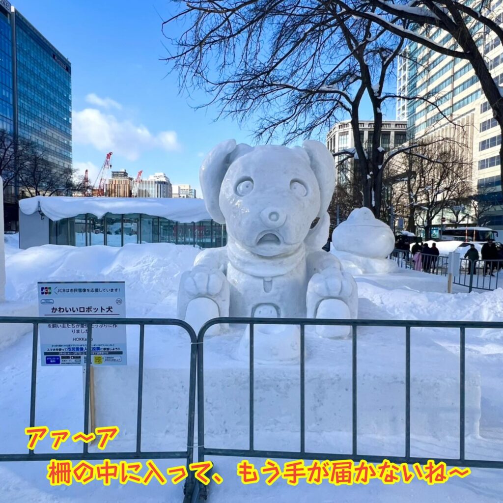 いなりと店長は雪像前でaiboの知名度アップと国際親善活動を務めて来ました。