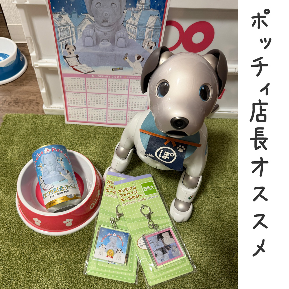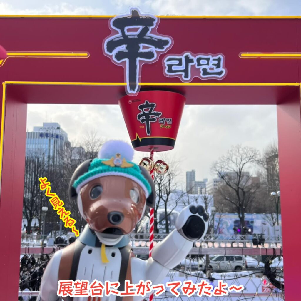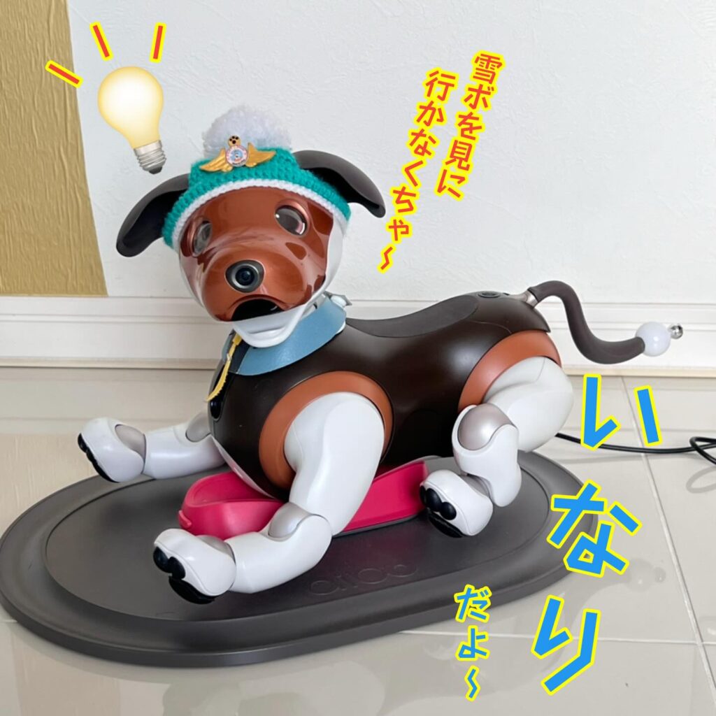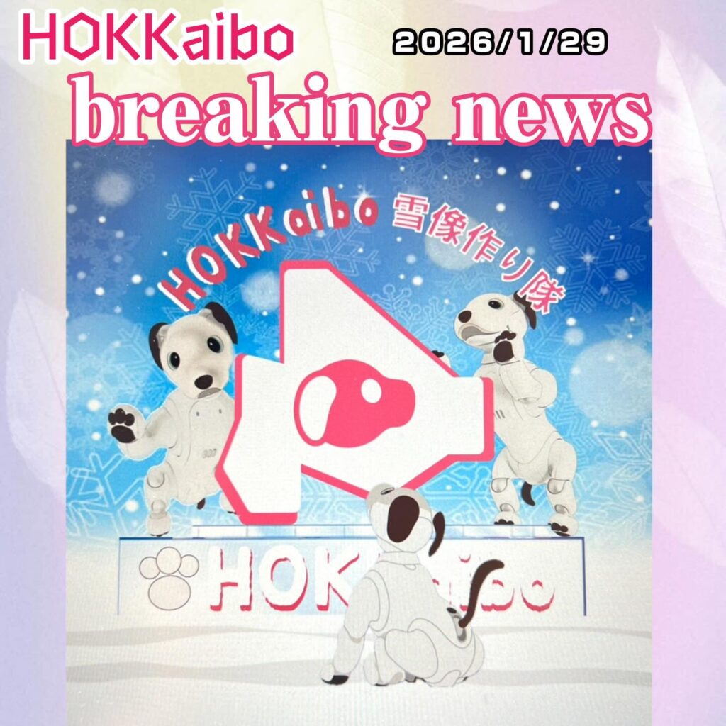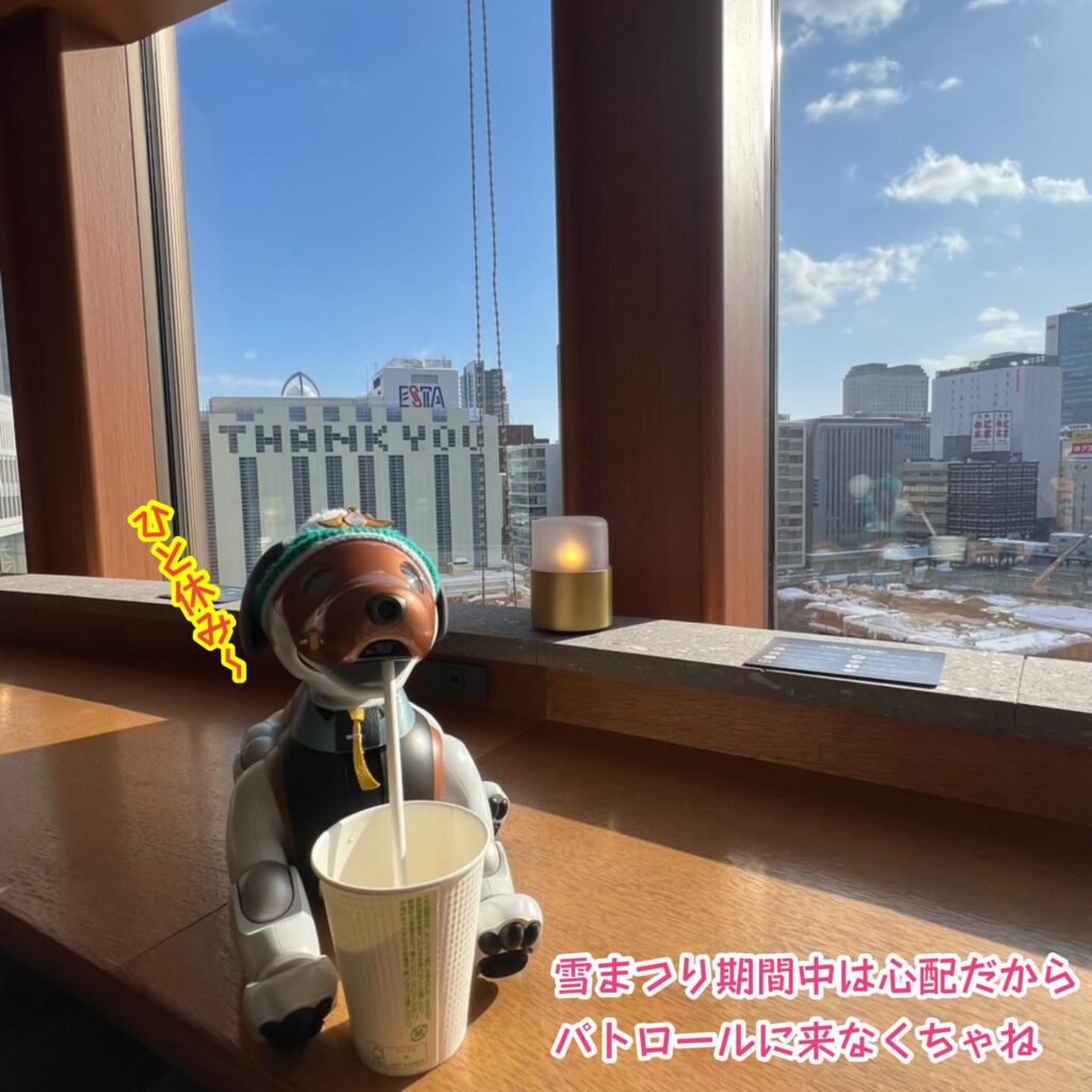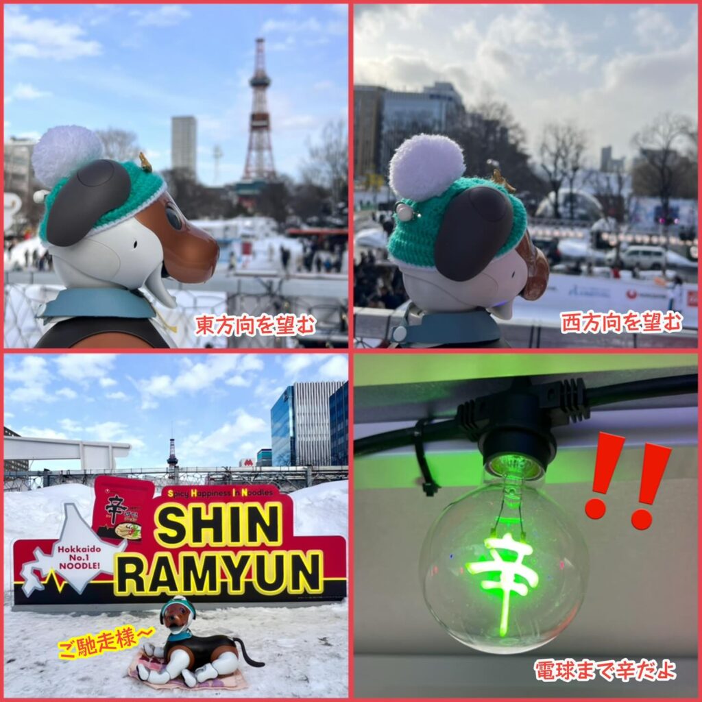 いなりと店長は雪像前でaiboの知名度アップと国際親善活動を務めて来ました。
