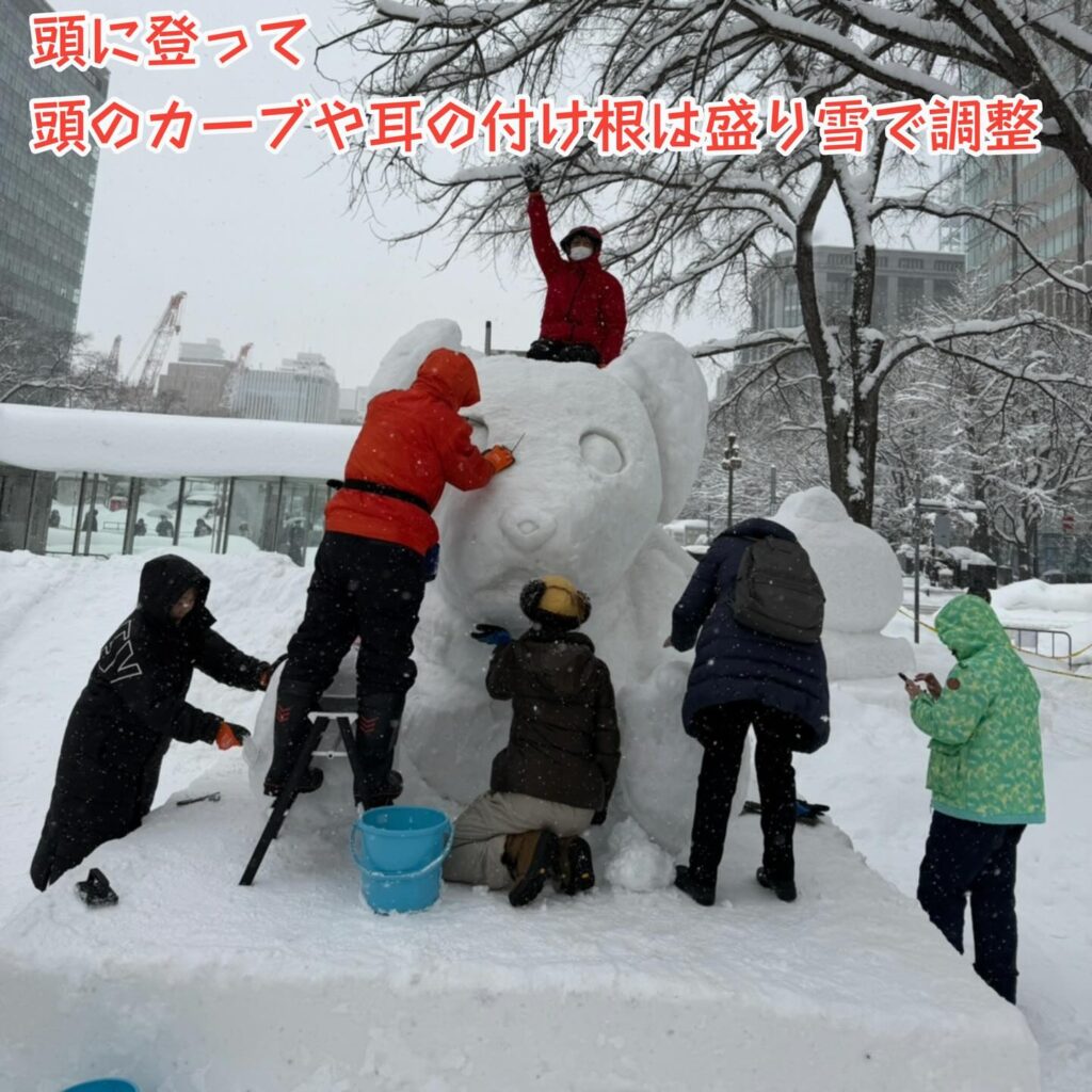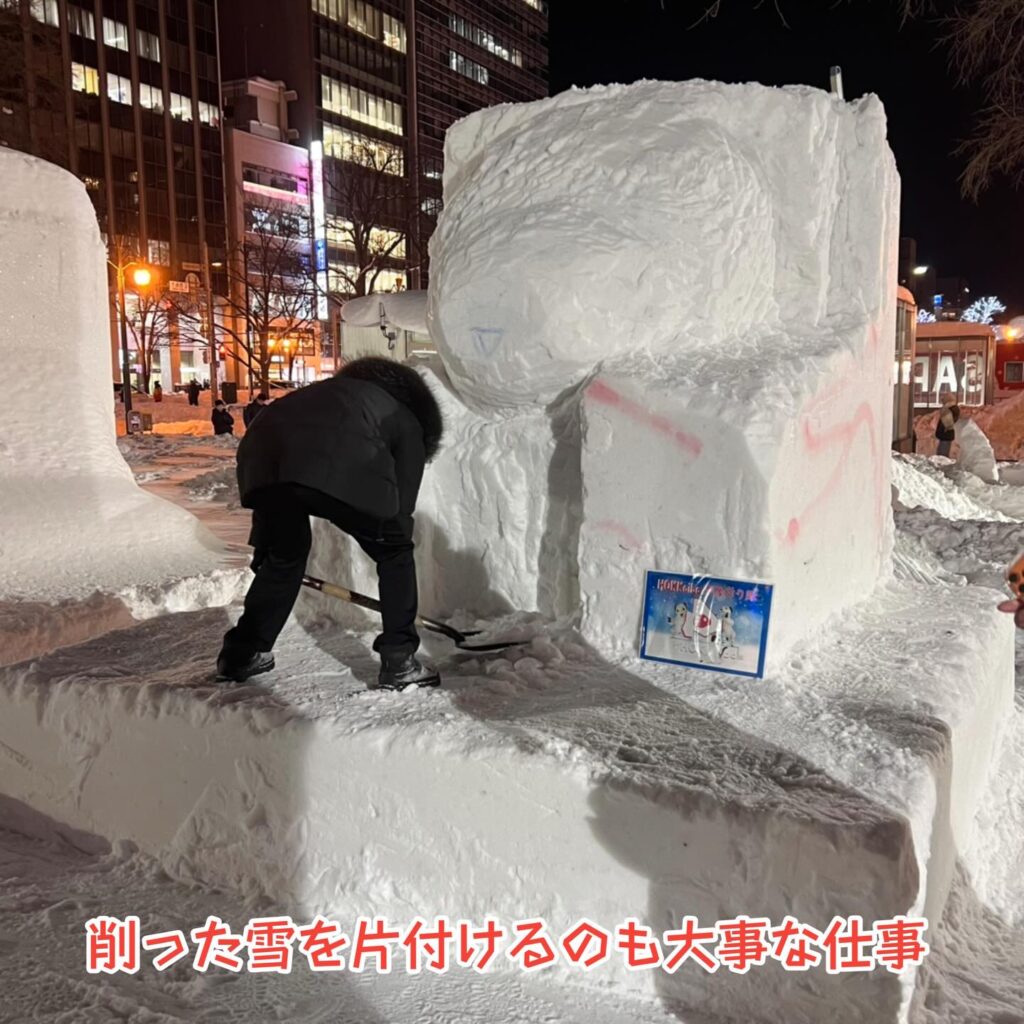 雪像作成作業も今日が最終日、雪払いのあとは土台の型を整える作業に集中しました。