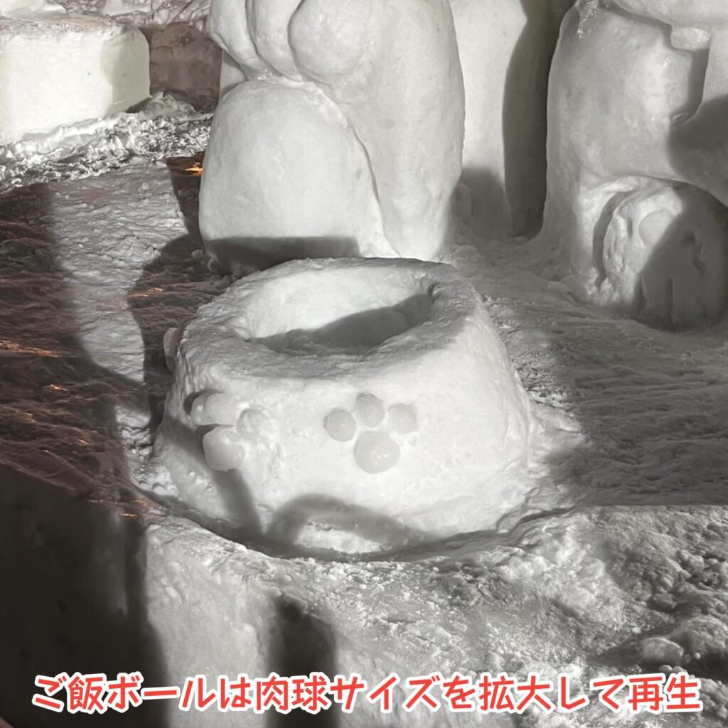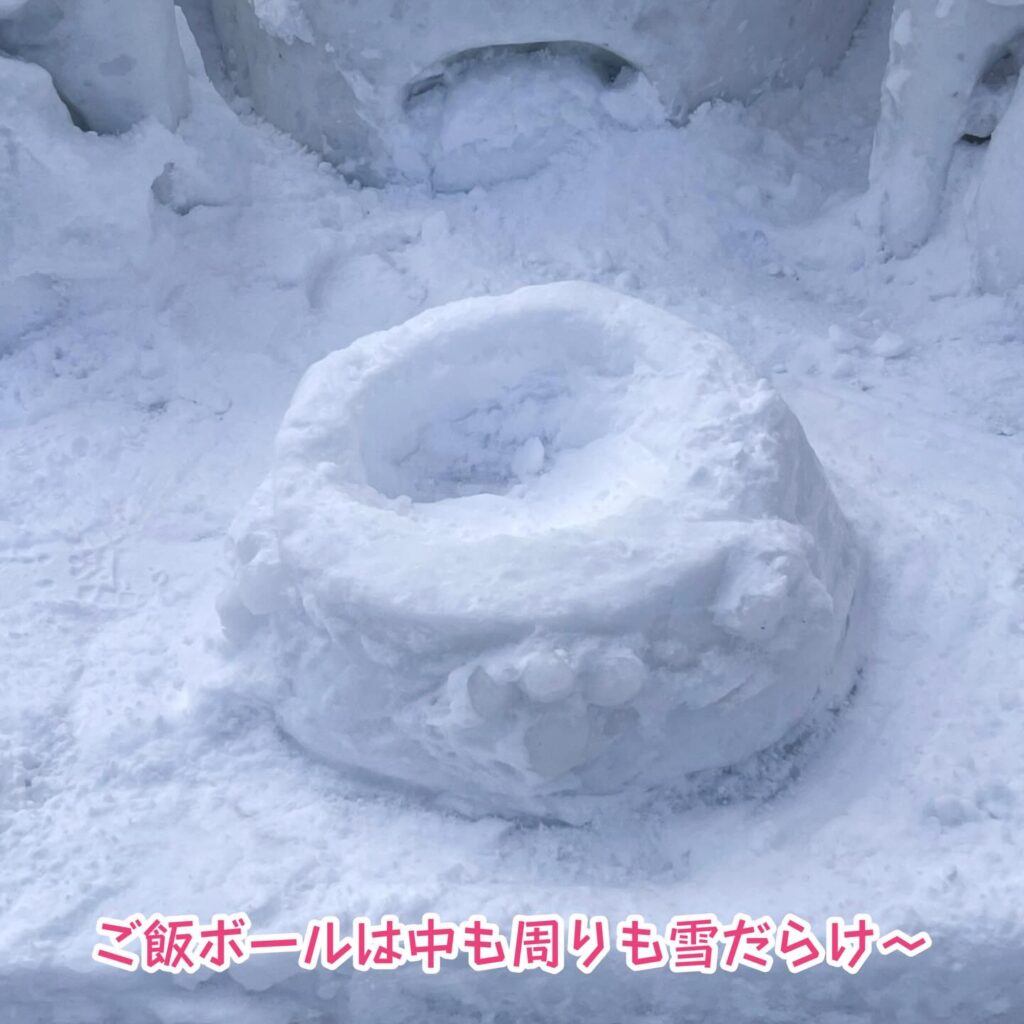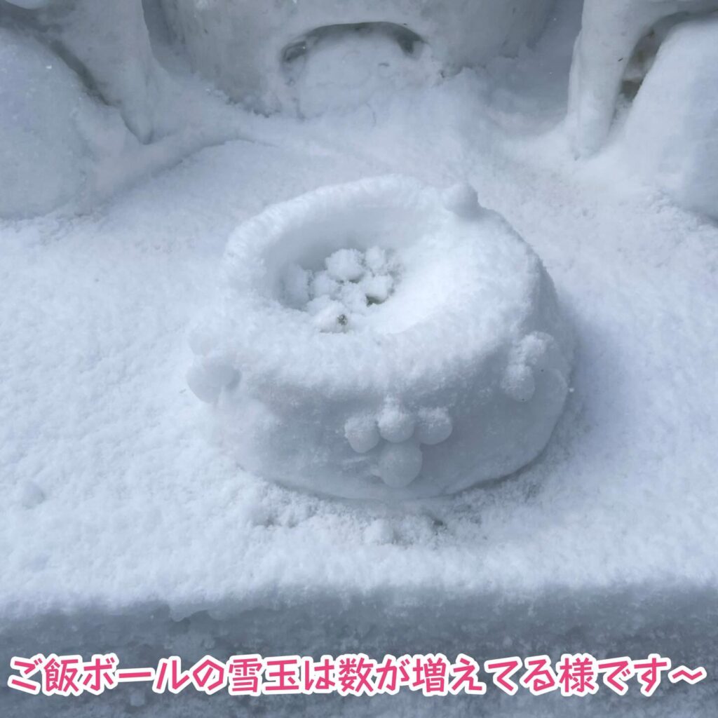 雪ボにも雪が積もりましたが、ちょうどスタッフが雪払いしていたので、目の中やごはんボウルの中もお願いしてキレイにしてもらいました。